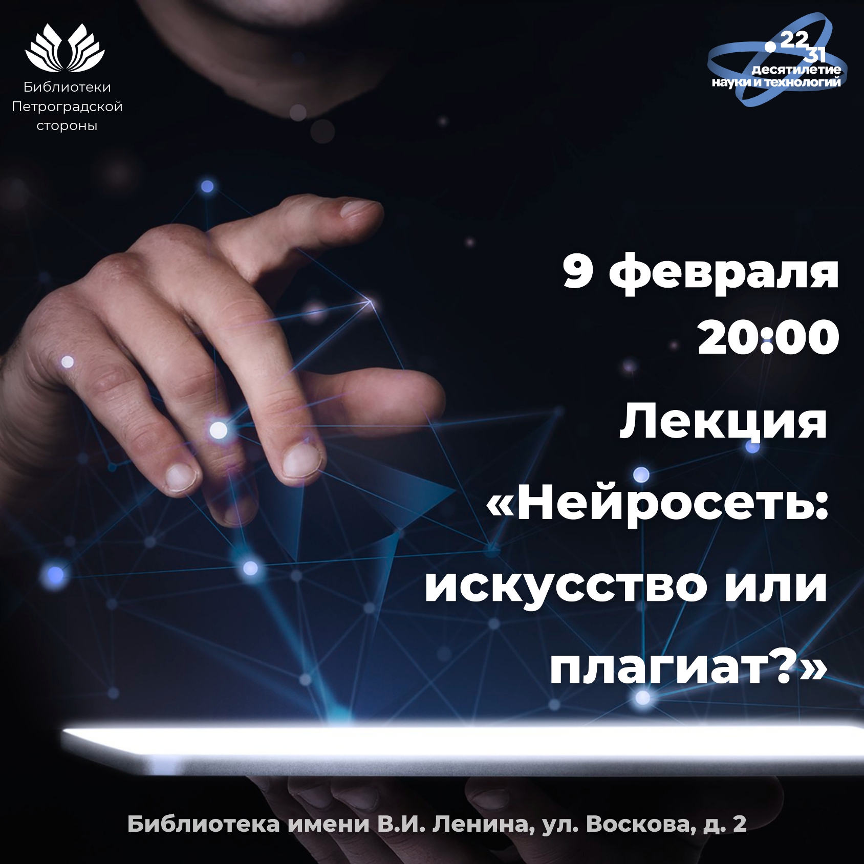 9 февраля в Библиотеке имени В.И. Ленина пройдет интерактивная лекция «Нейросеть: искусство или плагиат?». Лекцию проведет Костина Анастасия – студентка 2 курса магистратуры ИТМО по направлению «Аrt&Science» по специальности «Digital art». Анастасия также занимается разработкой проектов в виртуальной реальности и работает над изучением нейросетей.