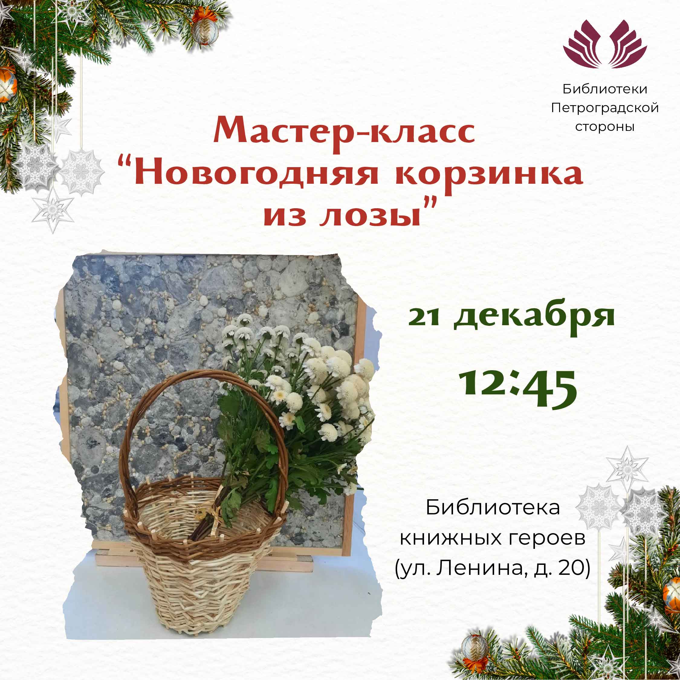 21 декабря в 12:45 Библиотека книжных героев (улица Ленина, дом 20) приглашает на мастер-класс по плетению чудесных новогодних корзин из лозы!