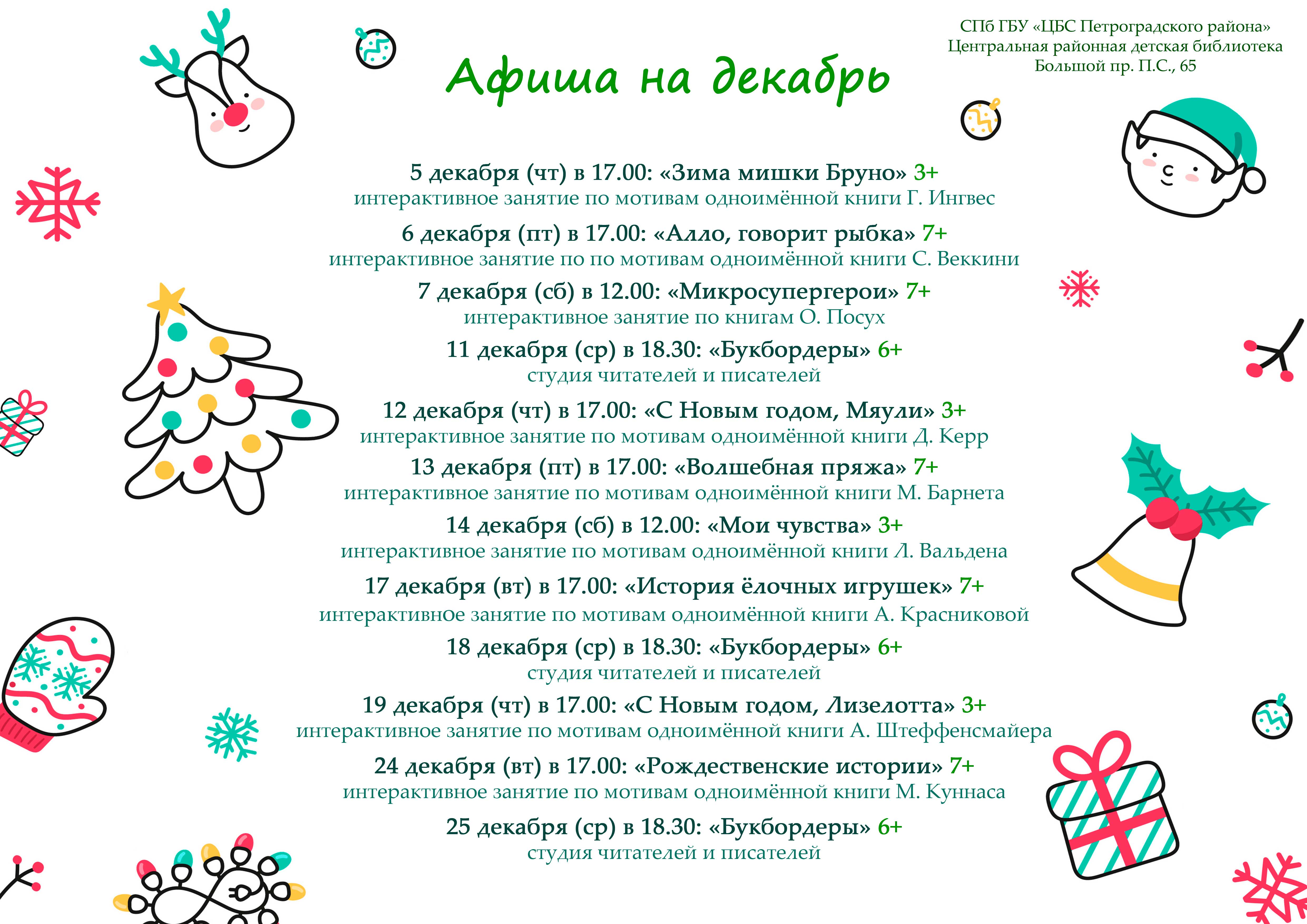 Вход на все анонсированные занятия свободный, участие абсолютно бесплатное. До скорых праздничных встреч в библиотеке!
