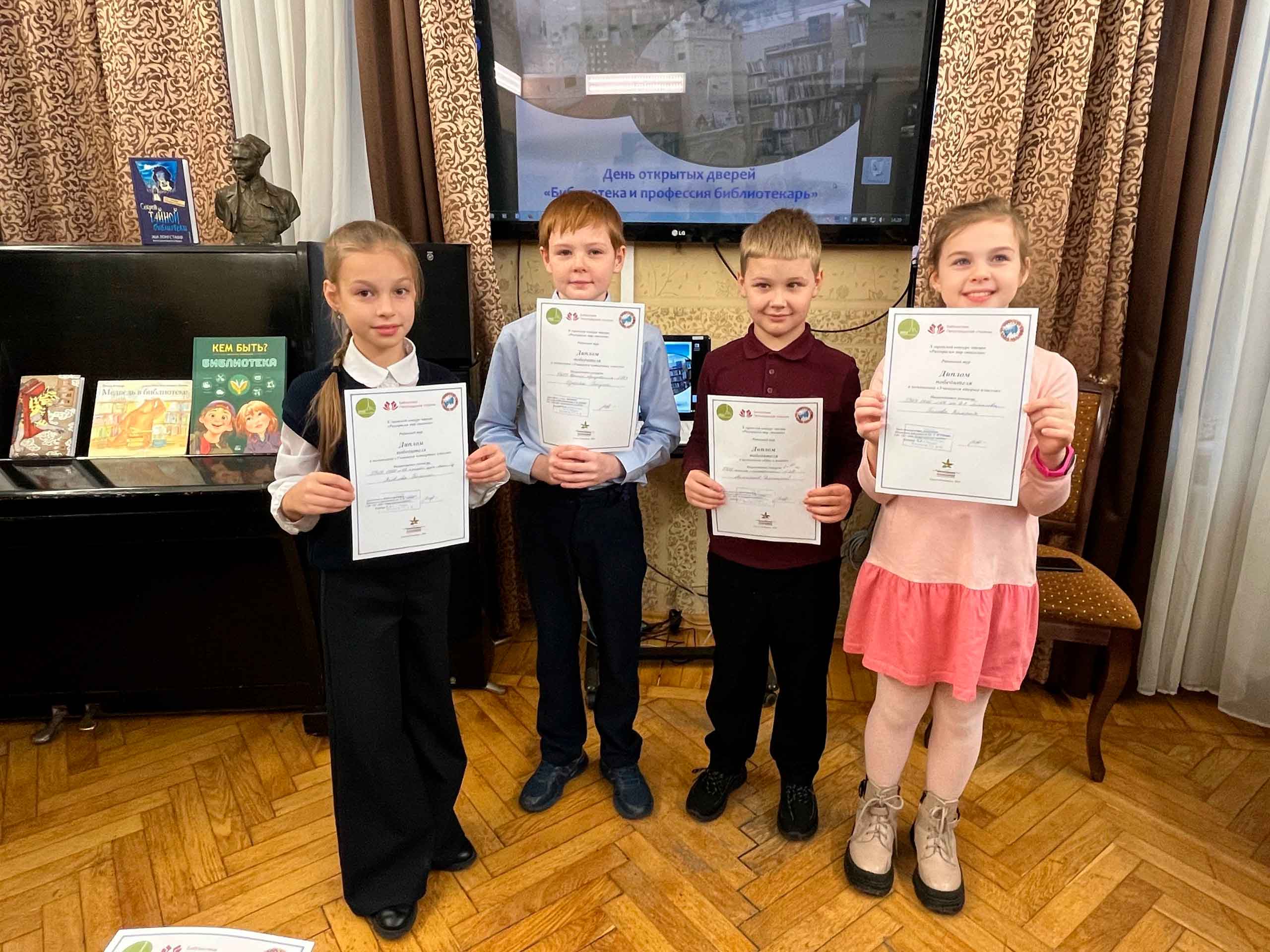 В этот день в библиотеке проходило вручение дипломов победителям районного этапа X городского конкурса чтецов «Разукрасим мир стихами — 2024». В конкурсе принимали участие учащиеся 1- 4 классов из школ и гимназий Петроградского района.