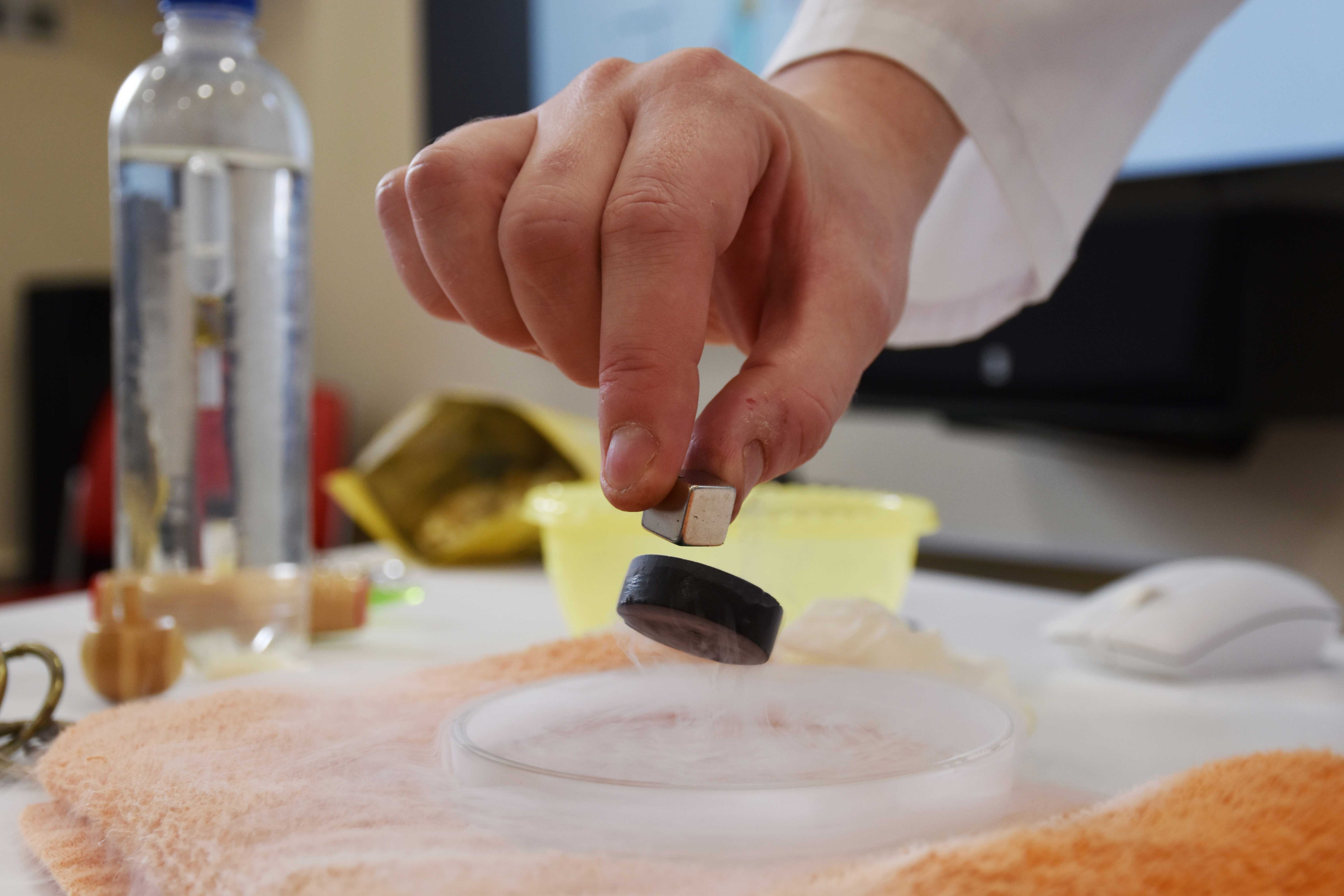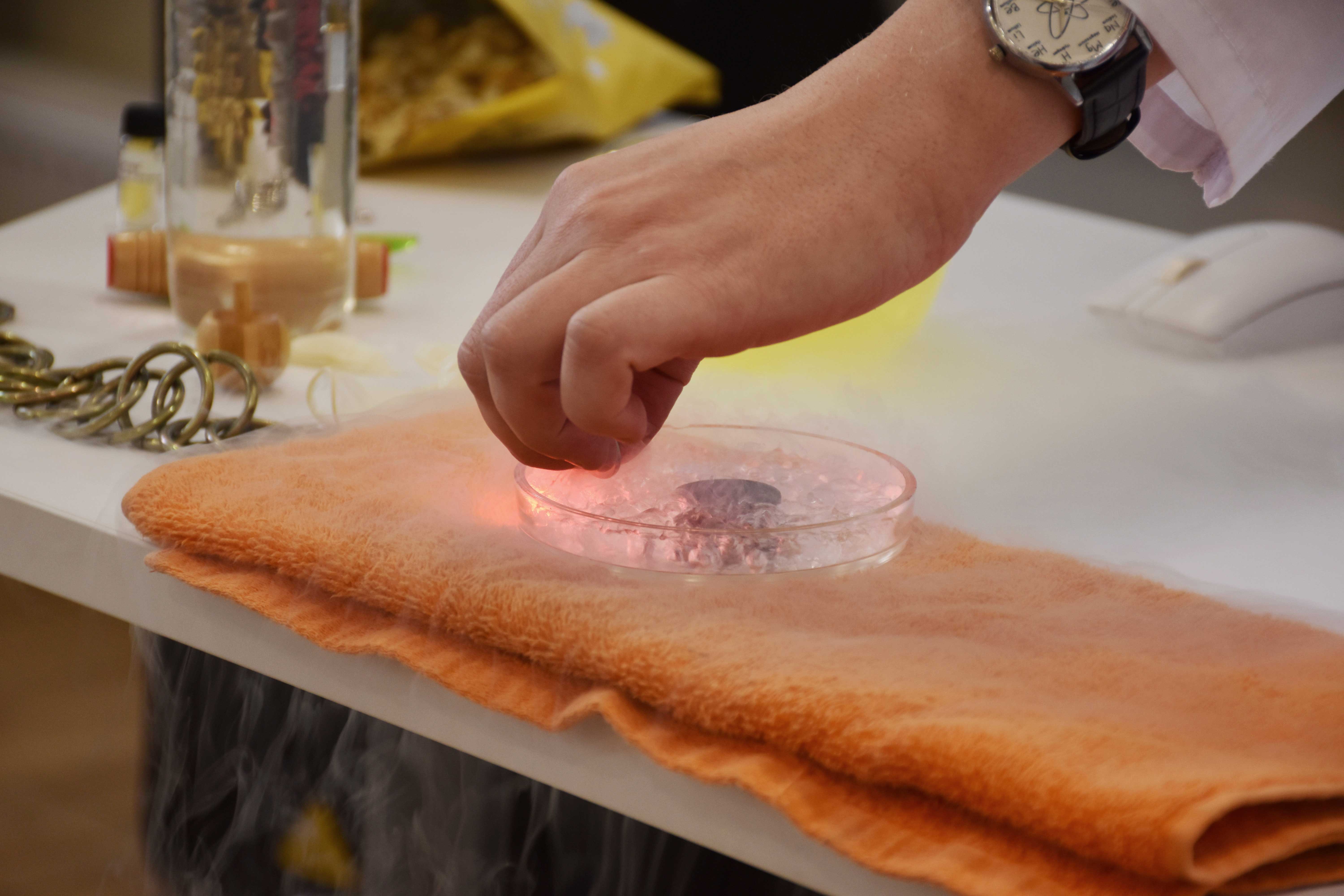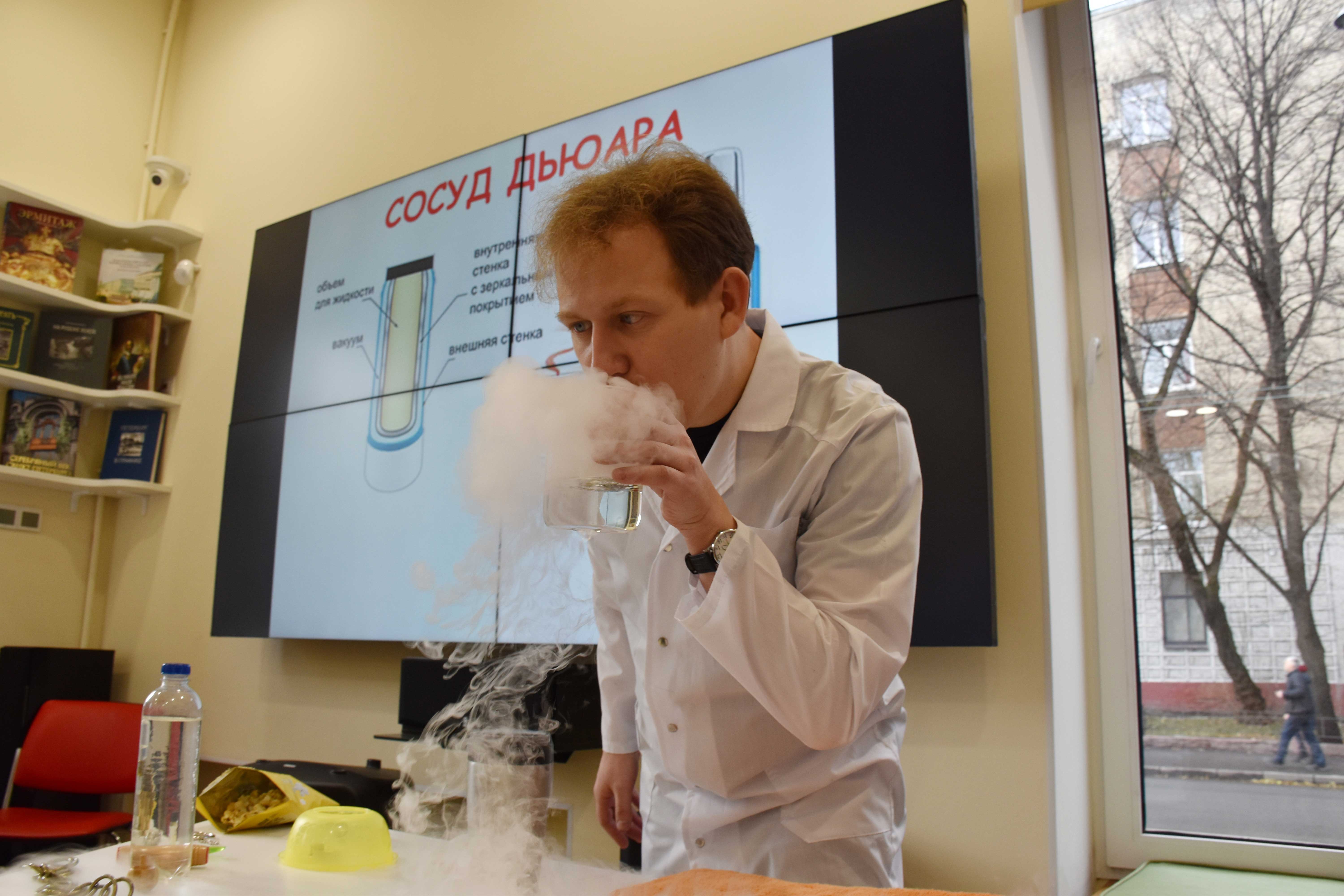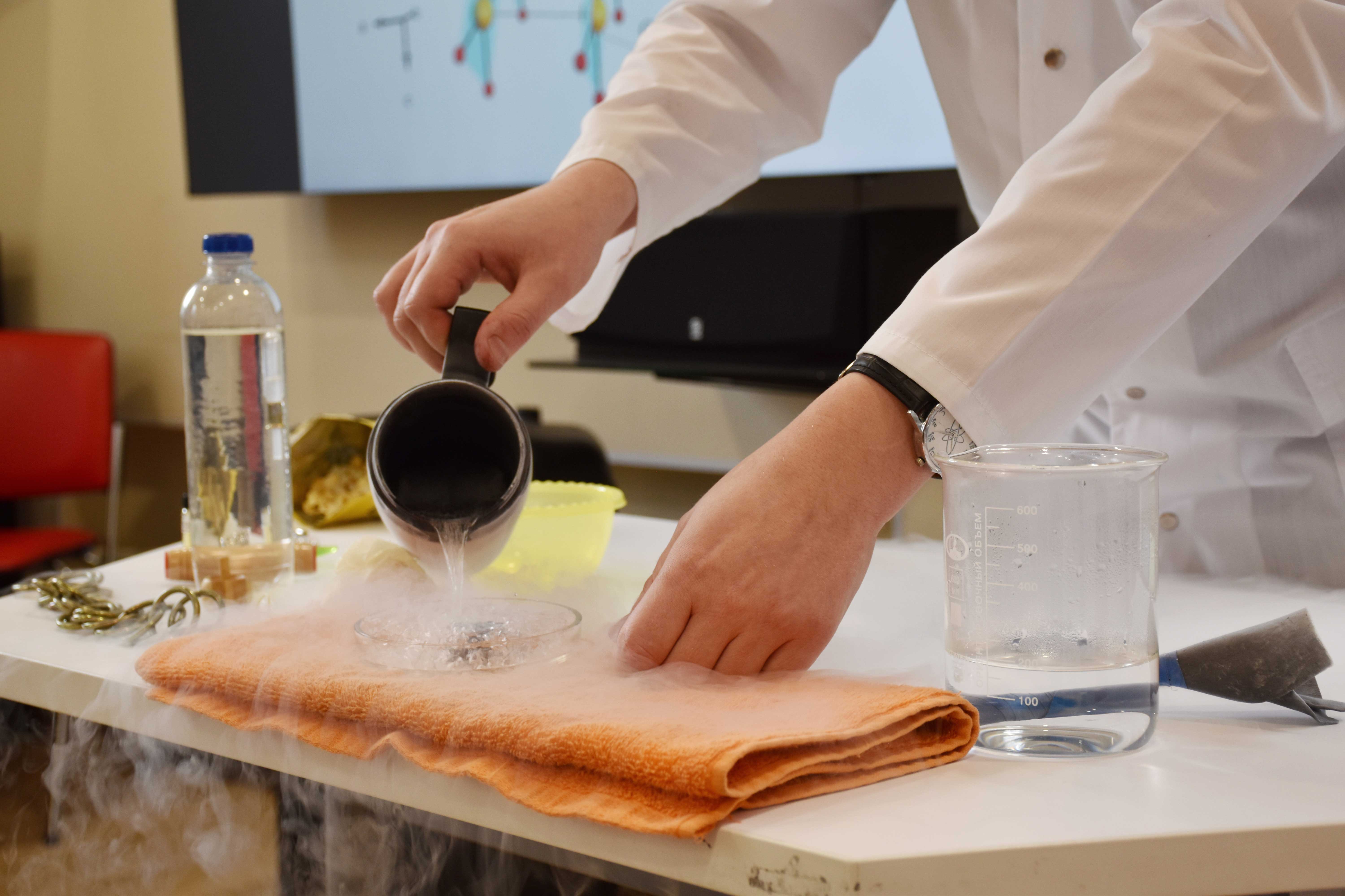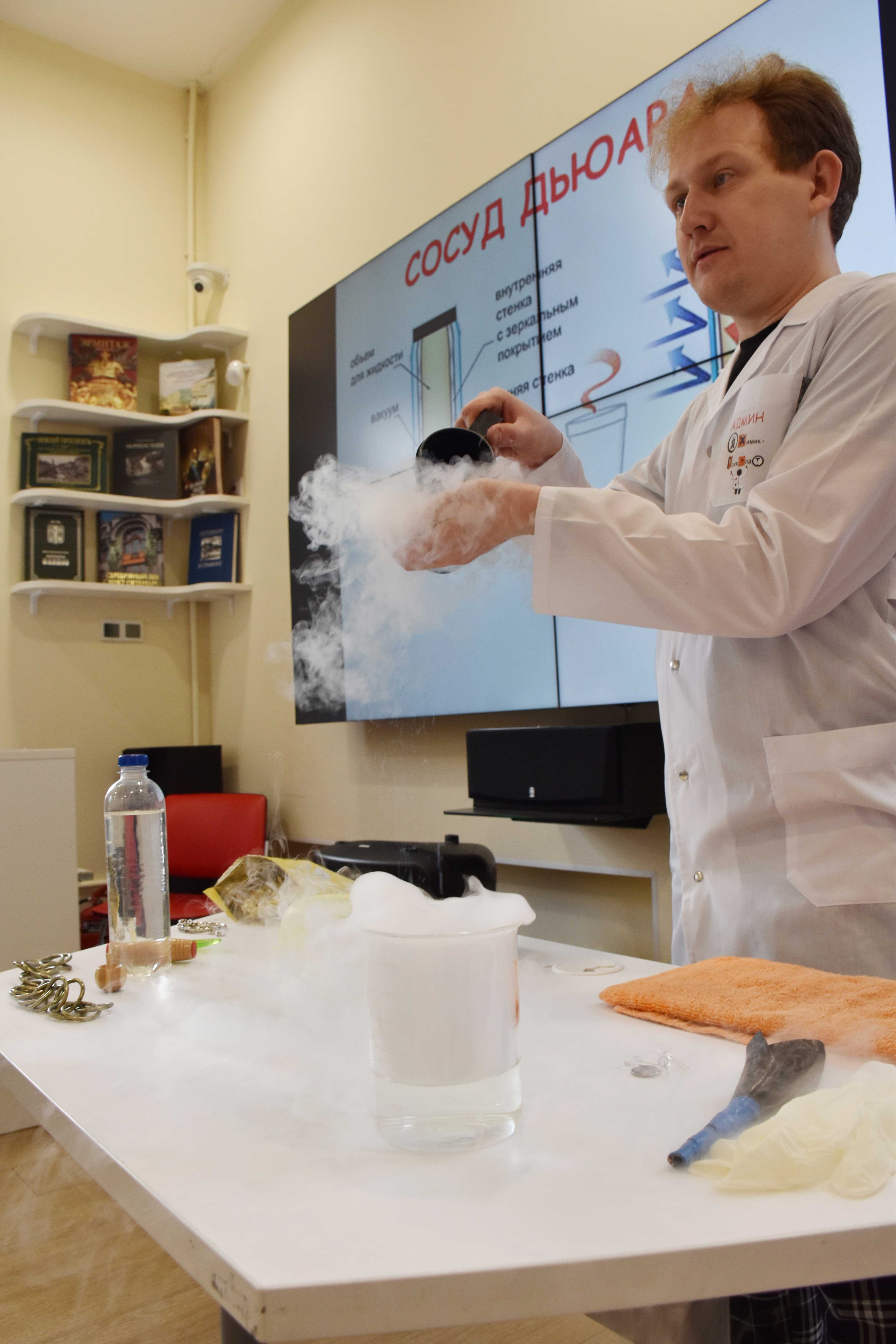 После теста Алексей Евсюков подробно разобрал каждый вопрос тестового задания и, самое великолепное - провел с участниками химические опыты. Каждый из присутствующих смог убедиться в существовании левитации, проверить длину световой волны и поэкспериментировать с жидким азотом.
