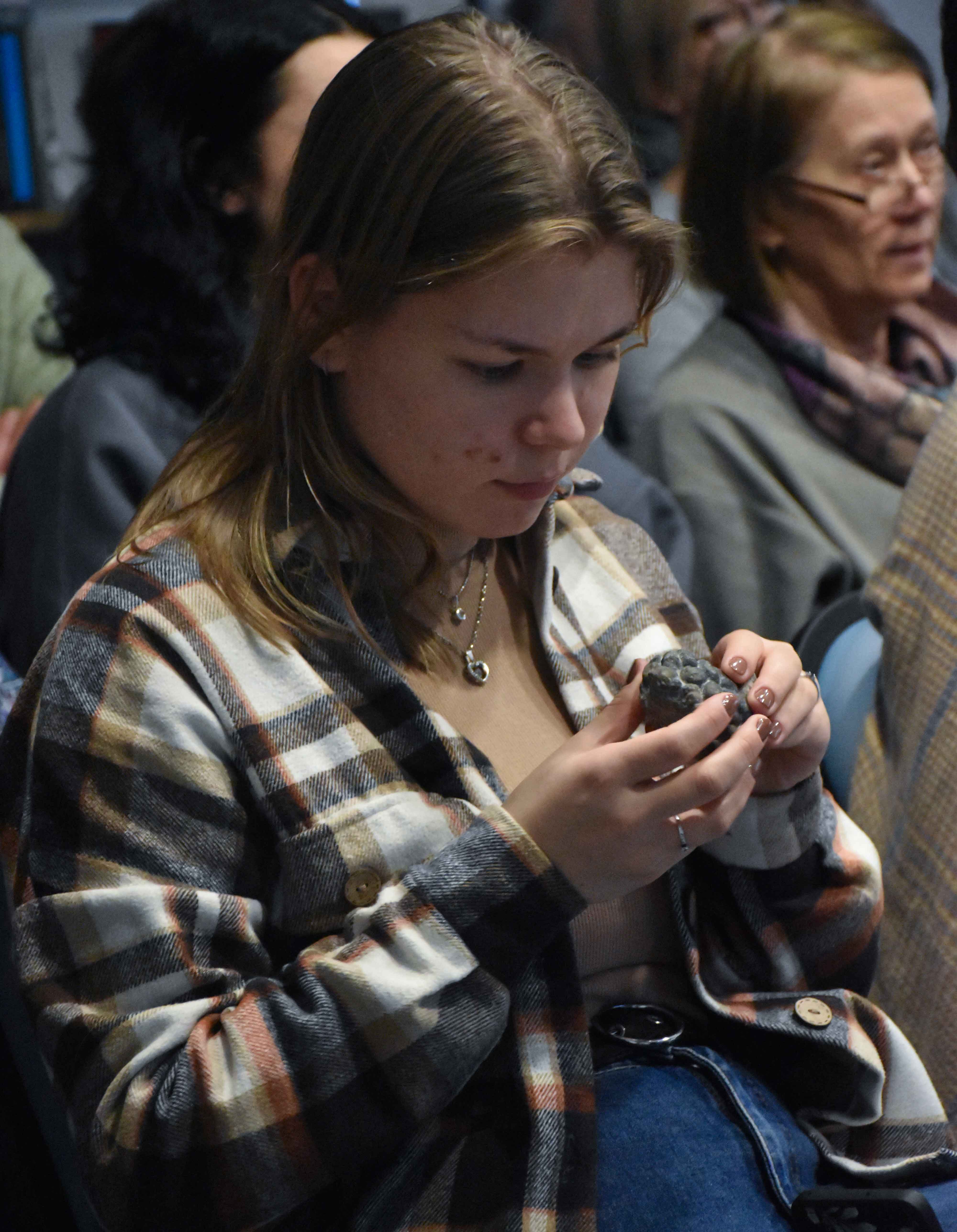 Анастасия Золина поделилась опытом археологических экспедиций, проходивших на Чукотке, в Карелии, в Ульяновской и Ленинградской областях. Слушатели узнали об особенностях поиска и изучения следов древних растений и животных в окаменелостях. В процессе рассказа участники смогли вблизи рассмотреть некоторые образцы, обнаруженные на раскопках.