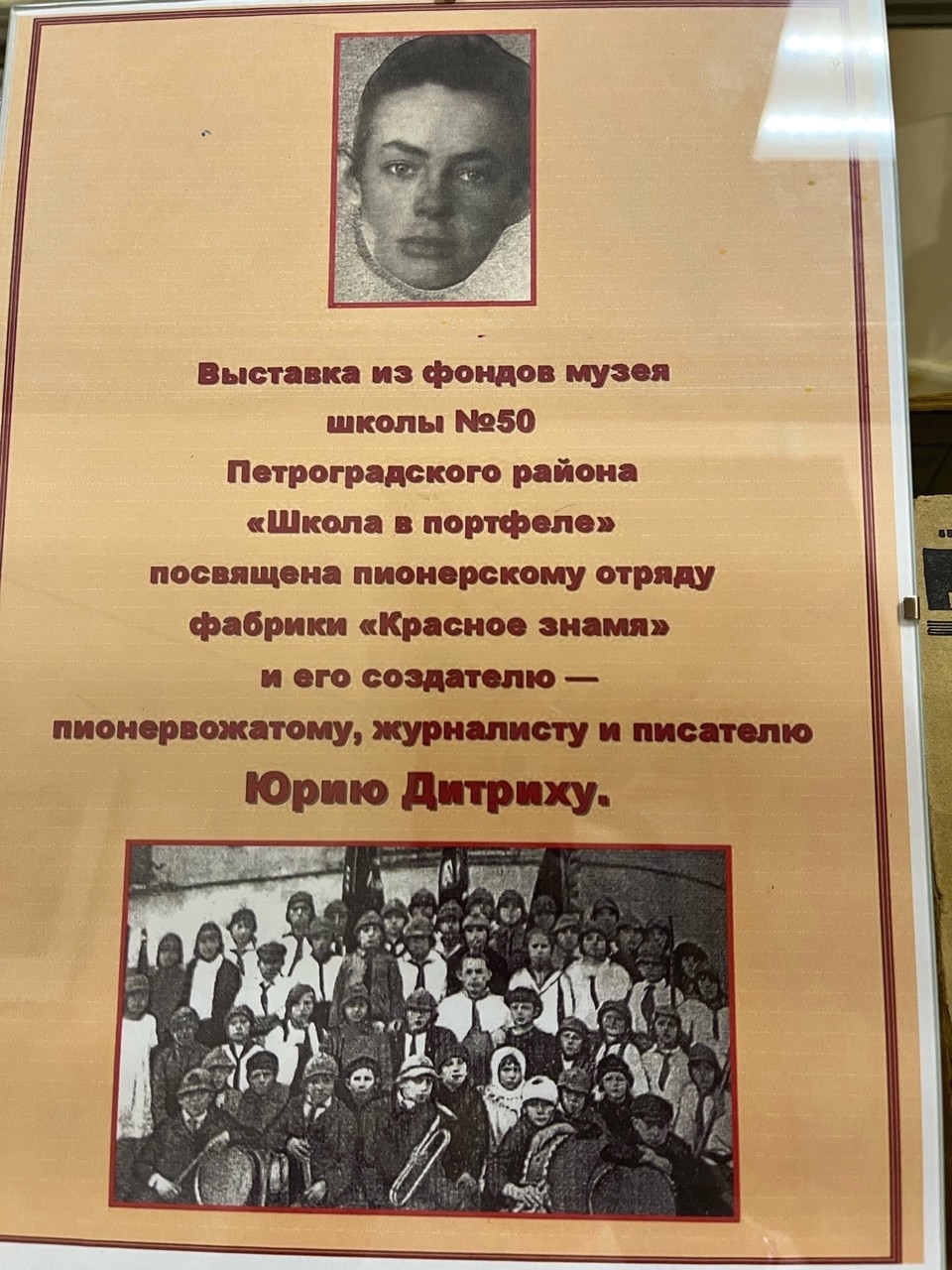 Выставку подготовил и открыл заведующий музеем школы № 50 Петроградского района Александр Леонидович Короткевич. 19 февраля 1923 года в Петрограде был организован первый пионерский отряд. Отряд объединил 140 детей рабочих и служащих фабрики в возрасте от 10 до 14 лет и был назван, как и фабрика — «Красное Знамя».