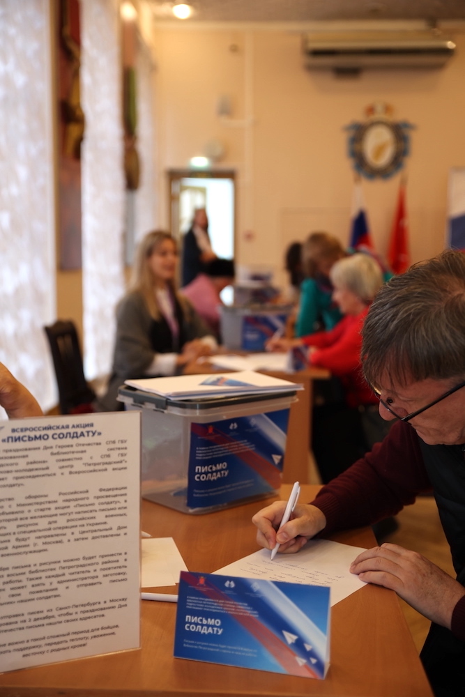 21 ноября Библиотеки Петроградской стороны присоединились к акции «Письмо солдату», объявленной Министерством обороны Российской Федерации совместно с Министерством народного просвещения России, в рамках которой все желающие могут написать письмо или нарисовать рисунок для российских военных, участвующих в специальной операции на Украине.