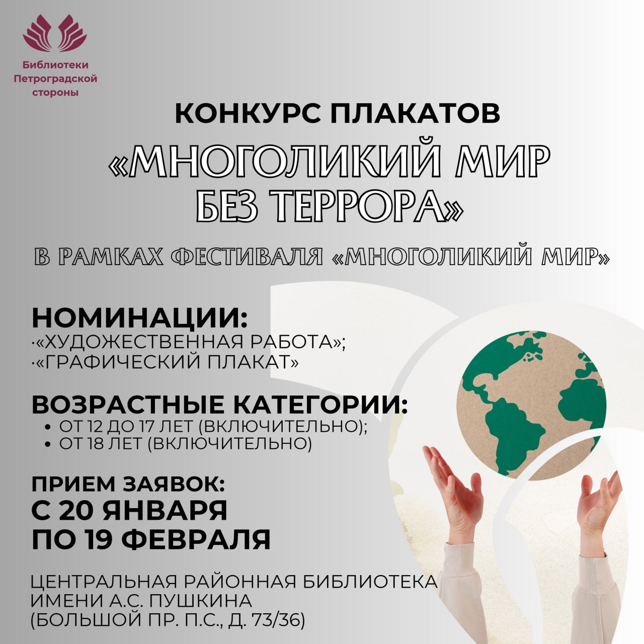 В Центральной районной библиотеке имени А.С. Пушкина (Большой пр. П.С., д. 73/36) с 20 января по 26 февраля пройдёт конкурс плакатов на тему «Многоликий мир без террора».