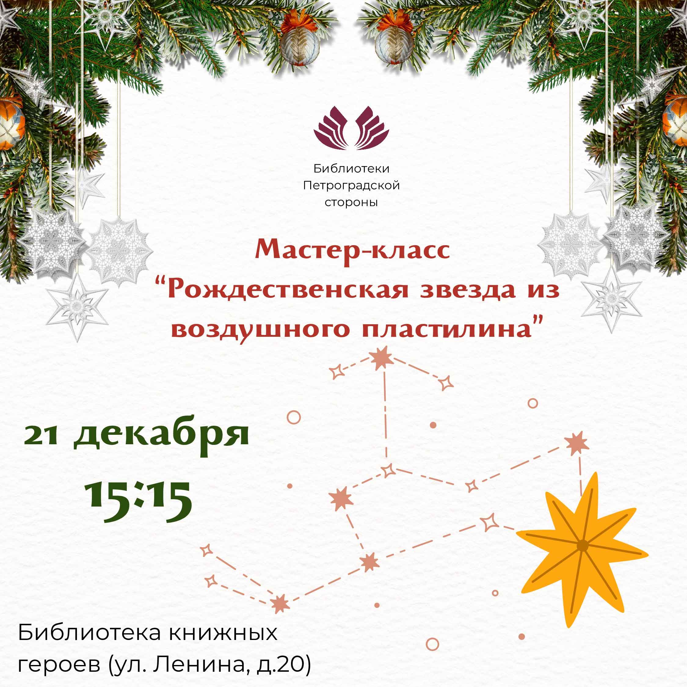 21 декабря в 15:15 в Библиотеке книжных героев (ул. Ленина, д.20) вас ждёт увлекательное занятие! Будем создавать своими руками чудесные рождественские звёзды из воздушного пластилина.
