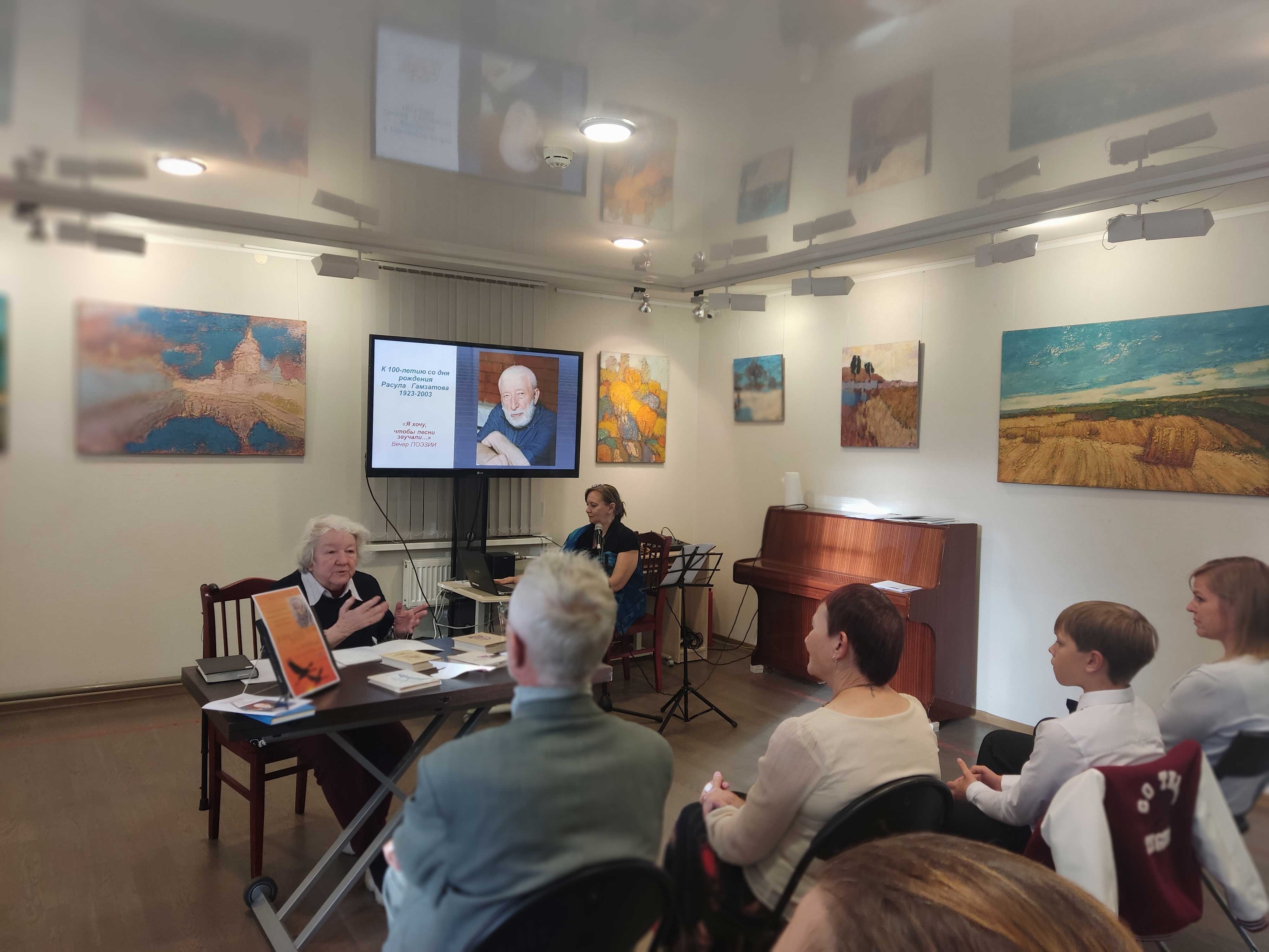 Его стихи представили: юный поэт Александр Григорьев, лауреаты поэтических конкурсов - Мария Климова и артист драмы Дмитрий Ефименко. Ведущая вечера, литературовед Любовь Сергеевна Новикова рассказала о жизни и творчестве поистине любимого своим народом поэта *горной страны.