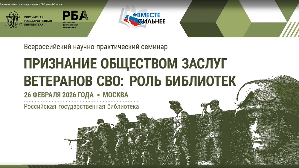 26 февраля 2026 года Российская государственная библиотека при поддержке РБА и Всероссийского библиотечного движения «Вместе сильнее» провели Всероссийский научно-практический семинар «Признание обществом заслуг ветеранов СВО: роль библиотек». Мероприятие направлено на выявление, обобщение и распространение лучшего опыта библиотек по оказанию поддержки участникам СВО и членам их семей.