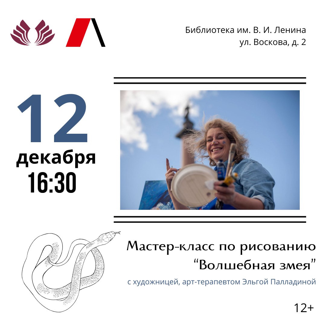 12 декабря в 16:30 приглашаем вас на мастер-класс по рисованию в Библиотеке имени В.И. Ленина (ул. Воскова, д.2). Вместе с преподавателем живописи, художником, арт-терапевтом Эльгой Палладиной мы создадим символ наступающего года - волшебную змею!