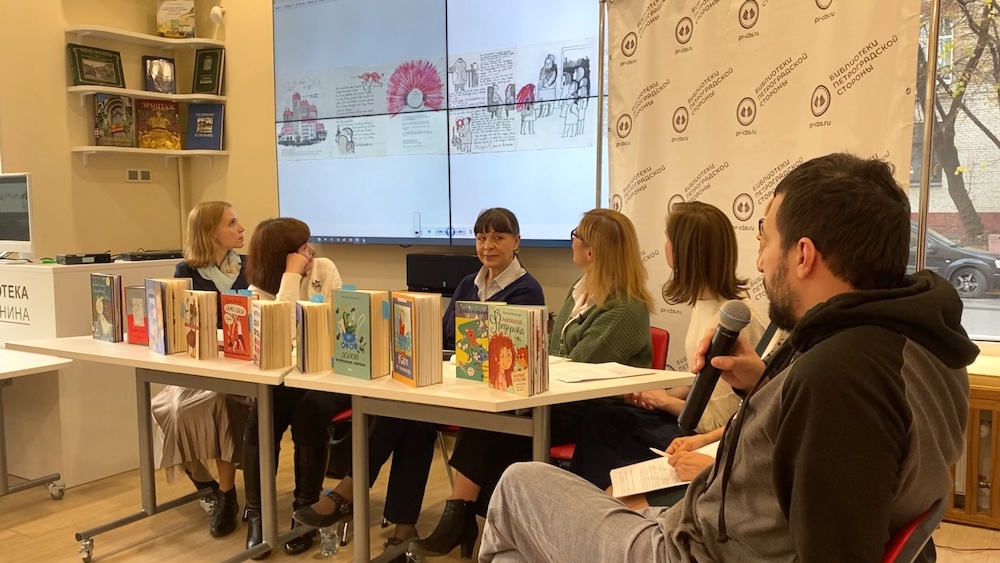 В беседе приняли участие автор детских книг Кристина Стрельникова («День глухого кита», «Не мешайте лошади балансировать», «Не ВКонтакте»), координатор информационной и библиотечной работы Гёте-института Виктория Чертовская, учитель немецкого языка школы Петришуле Анна Чернышева, книжные эксперты Библиотеки Ленина.