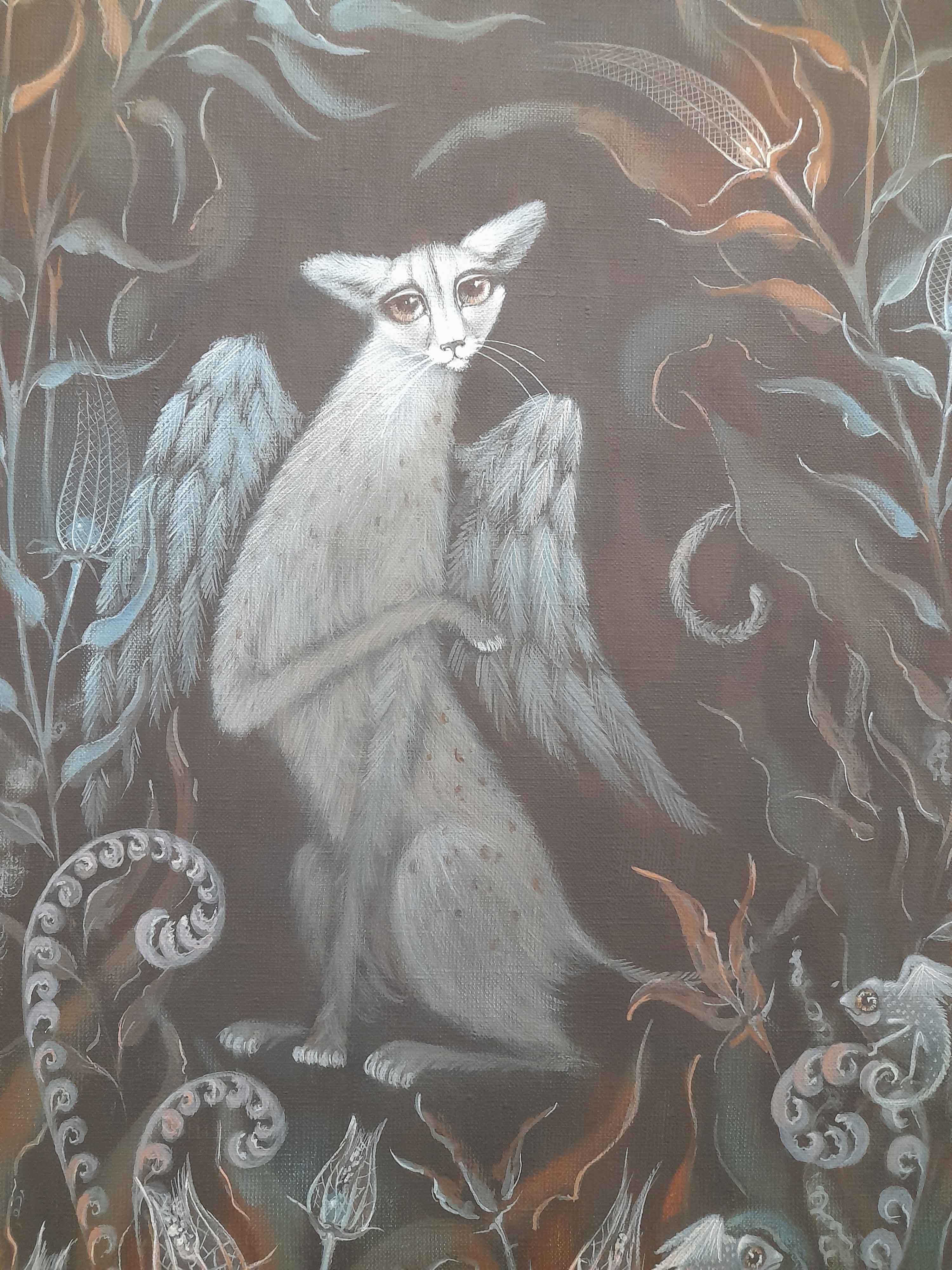 - В райской серии работ, основательная часть которых была представлена на выставке «Секрет твоих мыслей», существует особый магический райский сад, в котором работают свои законы и правила. Все герои моих картин взаимодействуют с земным и небесным пространством, влияя на него. Не зря многие из них крылаты – это один из самых надежных способов перемещения. Все персонажи имеют свои задачи и историю, они обладают сверхспособностями, но оно и понятно, ведь мир волшебный, и герои в нем тоже.