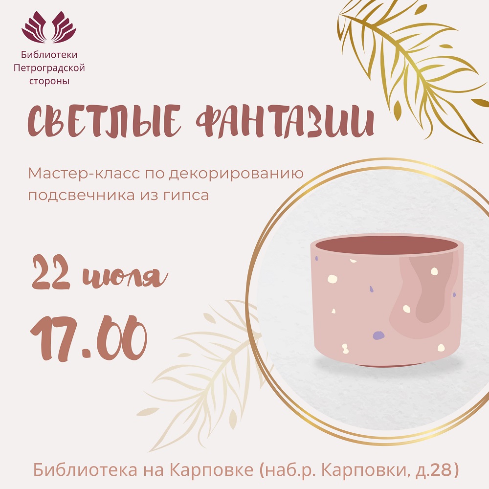 Приглашаем вас 22 июля в 17:00 в Библиотеку на Карповке (наб.р. Карповки, д.28) на увлекательный мастер-класс по росписи неповторимых гипсовых подсвечников! Под руководством мастера вы освоите секреты художественной росписи и создадите своими руками настоящий шедевр.
