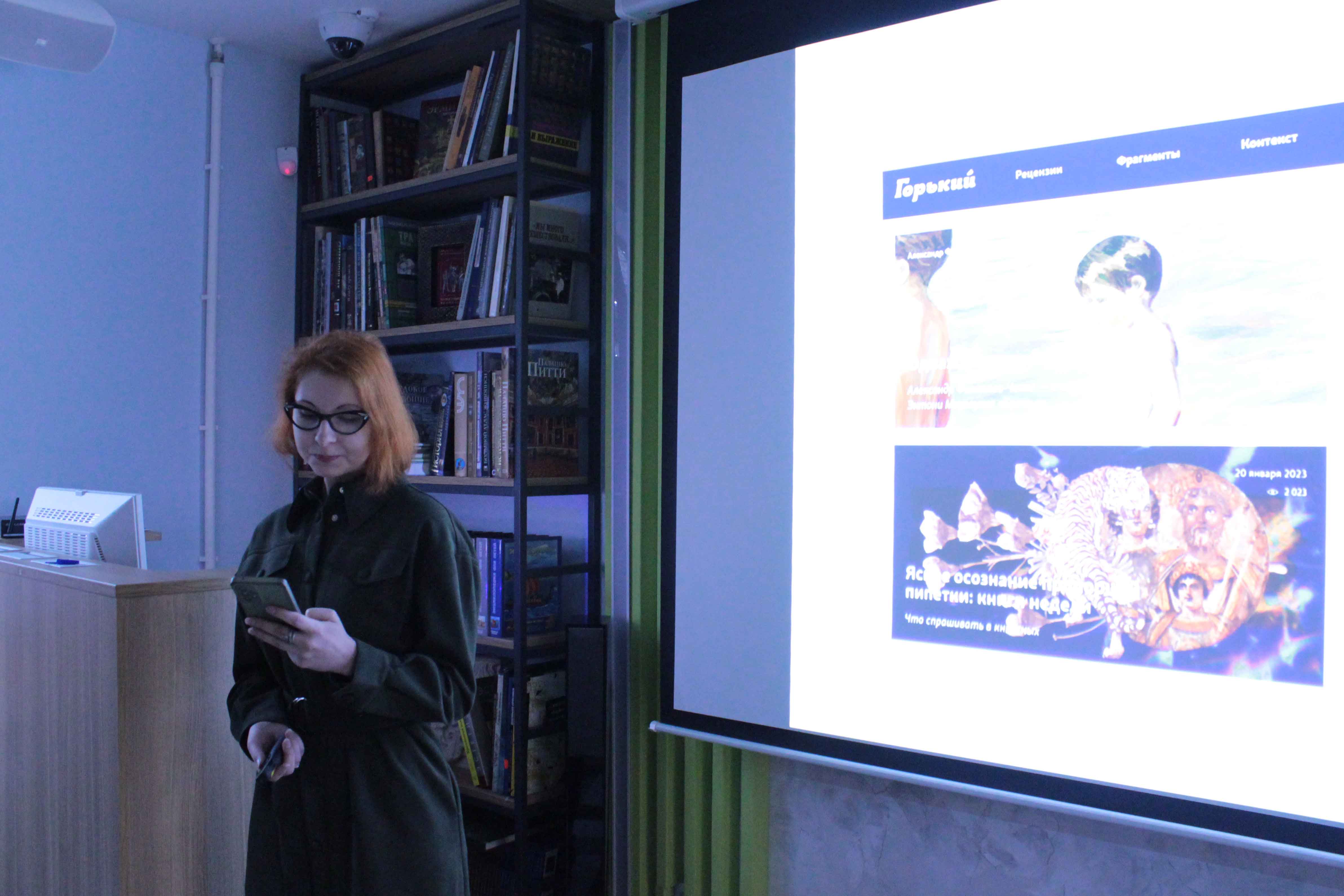 Ведущий библиограф ЦРБ имени А. С. Пушкина Анастасия Котельникова представила обзор «Современная книжная индустрия: за кем следить, чтобы быть в курсе событий».