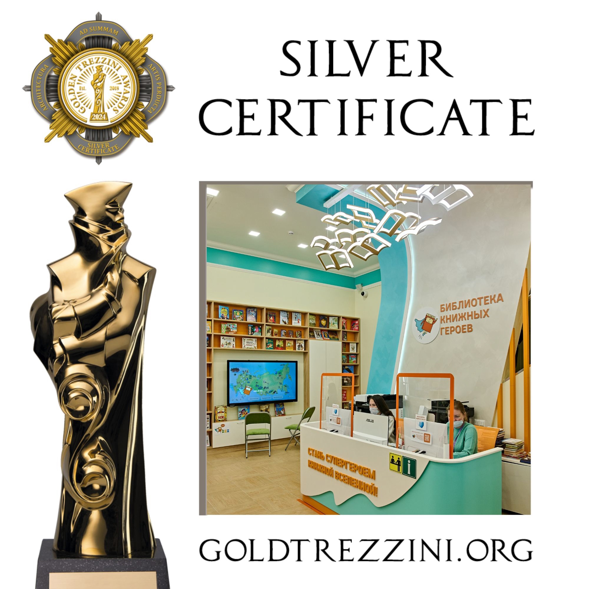 Инновационный Центр детского чтения "Библиотека книжных героев" (ул. Ленина, д.20) стал лауреатом Серебряного диплома премии «Золотой Трезини - 2024». Номинация – «Лучший дизайн-проект библиотеки».