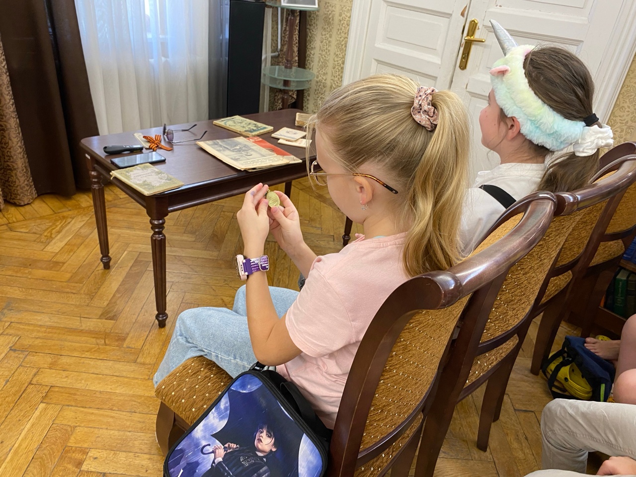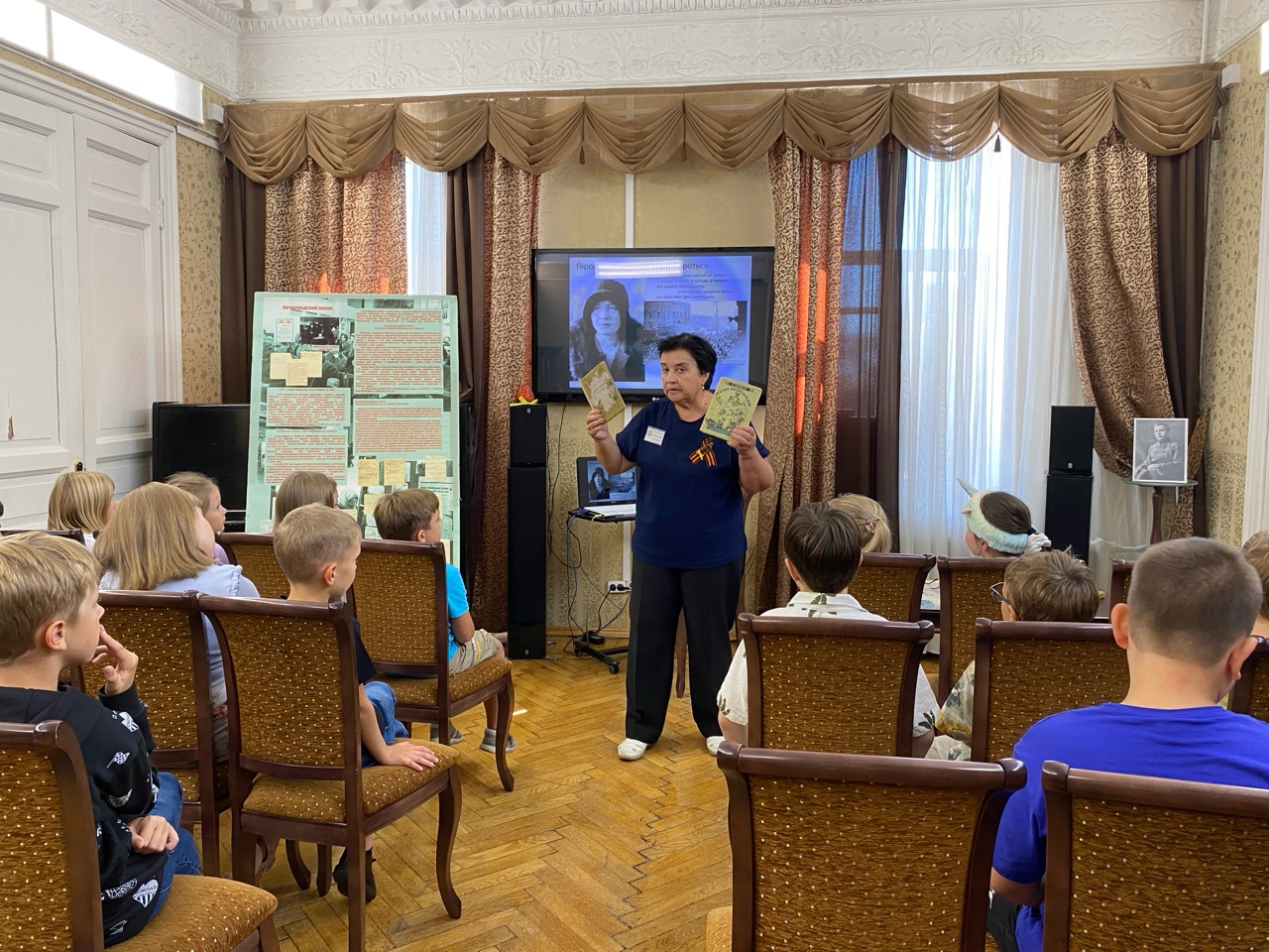 О жизни и работе библиотек Ленинграда и Петроградского района рассказала заведующая библиотекой Л.А. Кашпур. Дети узнали, что во время войны и блокады фонды библиотек пополнялись новыми книгами. Ребята смогли полистать и посмотреть уникальные архивные документы, книги и журналы с пожелтевшими страницами, которые выдавались много раз. На титульных листах сохранились пометки блокадного времени. Все смогли подержать в руках медали «За оборону Ленинграда» и настоящие продовольственные карточки. Гости посетили залы библиотеки, которые помнят суровые дни войны.
