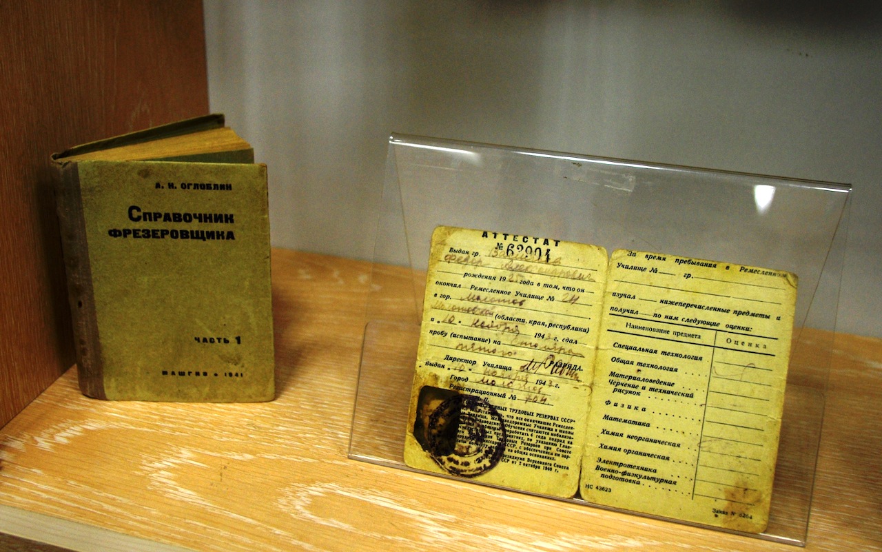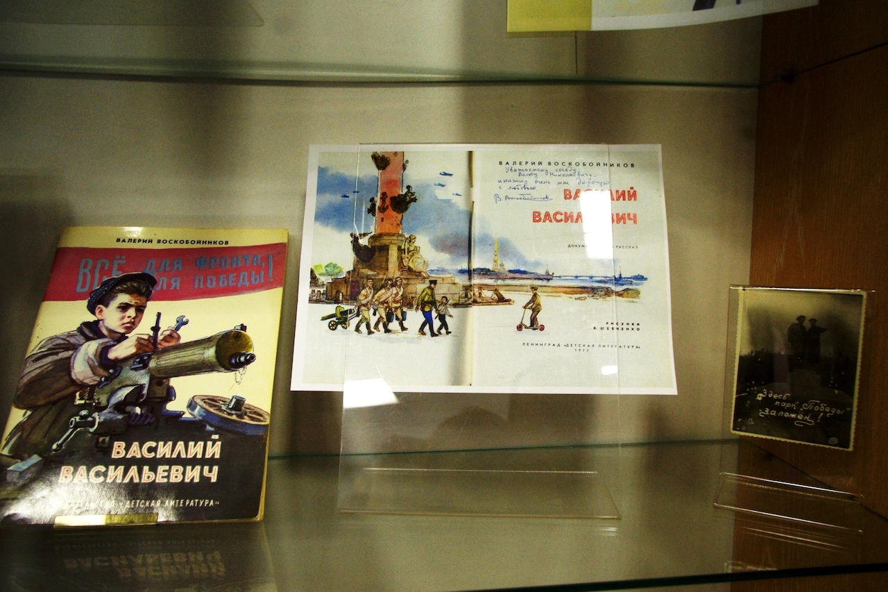 На выставке представлены справочники для молодых рабочих. Например, справочник токаря, изданный в блокадном Ленинграде в 1943 году в серии «В помощь молодому рабочему». Или справочник фрезеровщика — это рабочая специальность нашего героя. Вы посмотрите на открытку 1943 года художника Пилявского, посвящённую комсомольцу сварщику Евгению Головину перевыполнявшему норму на 350%, наградной талон на 200 грамм хлеба с соответствующей надпечаткой — «перевыполняющему норму». Представлены здесь аттестаты выпускников школы фабрично-заводского ученичества и ремесленных училищ 1930-х годов и времен ВОВ, таких же мальчишек, как и Василий Васильевич. Есть фотография, на которой запечатлены два подростка на постаменте будущего парка Победы. Теперь они восстанавливают город и под произвольным памятником на фотографии они сделали надпись «Здесь парк Победы заложен!»