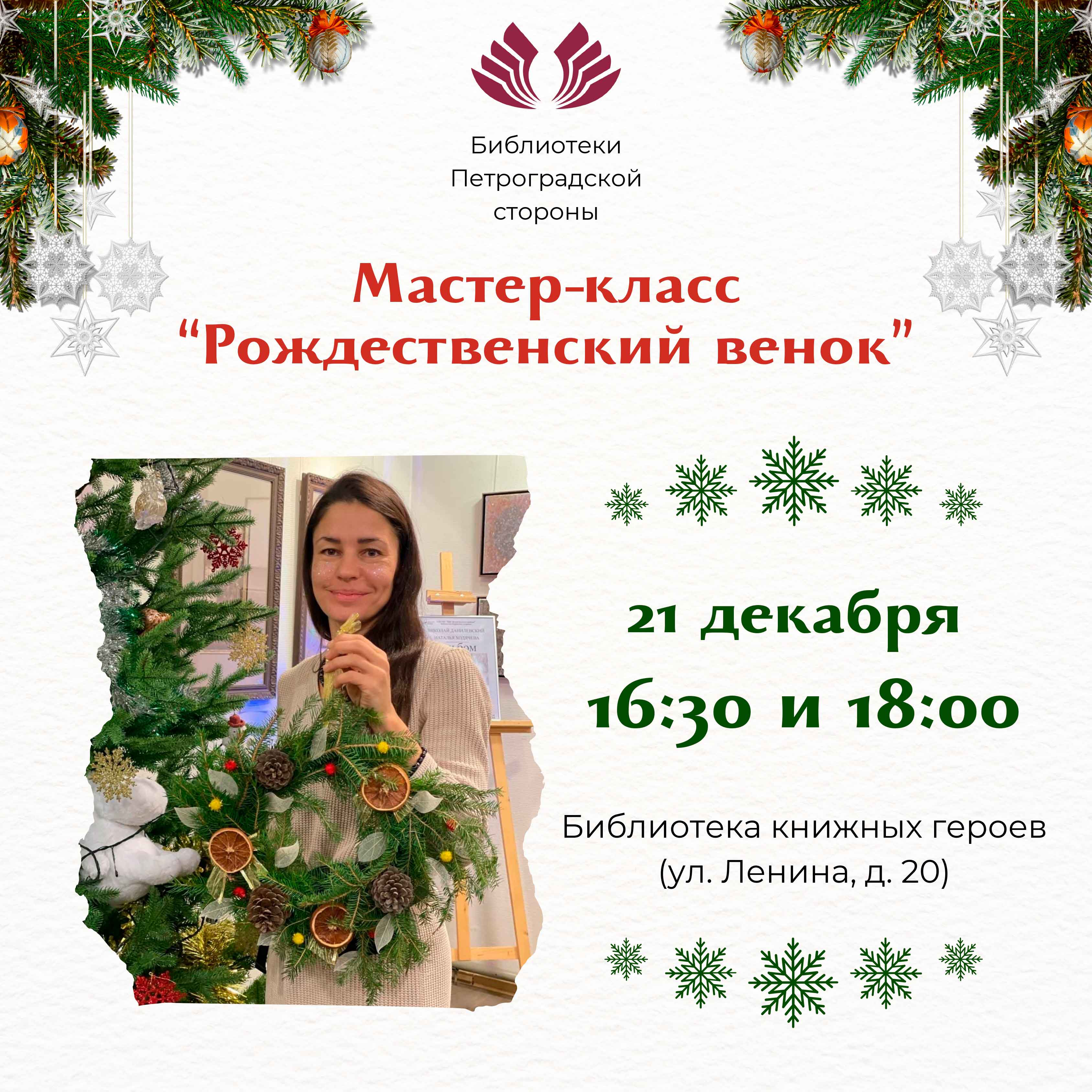 21 декабря в 16.30 и в 18:00 Библиотека книжных героев (ул. Ленина, д.20) приглашает на мастер-класс «Рождественский венок».