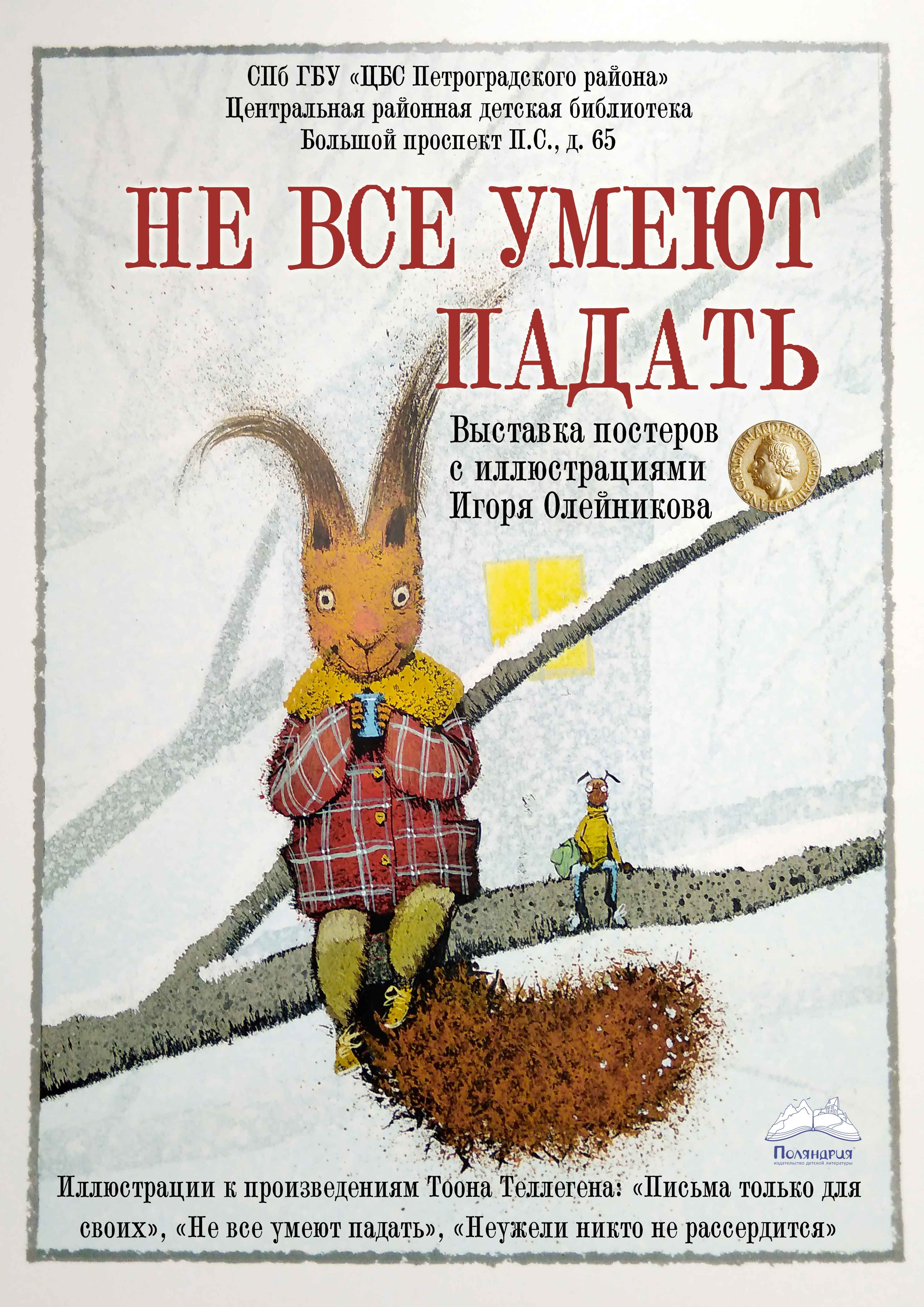 Весь март в Центральной детской библиотеке Петроградского района (Большой пр. П.С., 65) экспонируется выставка постеров с иллюстрациями Игоря Олейникова к книгам Тоона Теллегена «Не все умеют падать», «Письма только для своих», «Неужели никто не рассердится».