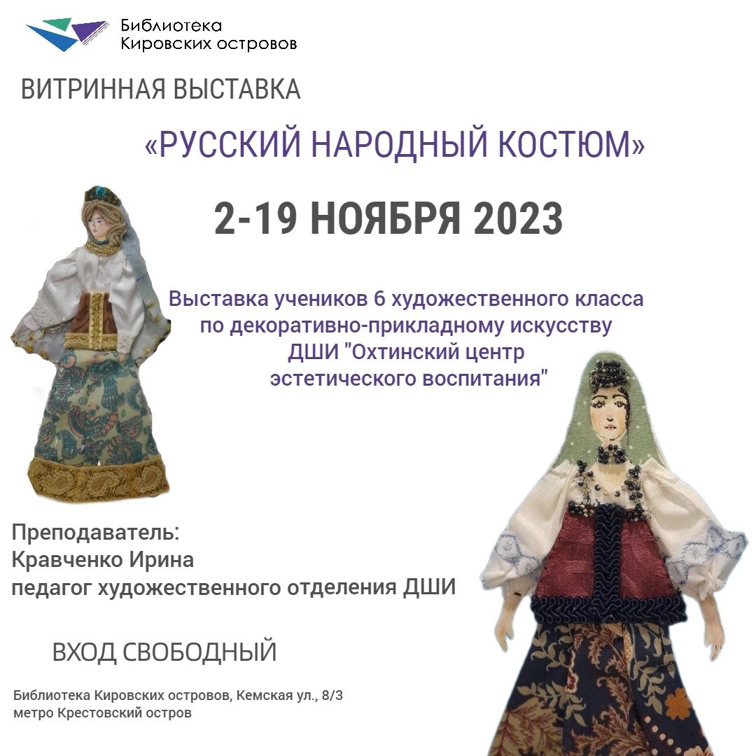 Ко дню народного единства в библиотеке Кировских островов открылась витринная выставка «Русский народный костюм». Ученики 6 художественного класса по декоративно-прикладному искусству под руководством преподавателя Ирины Кравченко ДШИ «Охтинский центр эстетического воспитания» представили работы, выполненные в технике сюжетной объемной аппликации из ткани. Мастерски сделанные работы, демонстрируют зрителям русских красавиц и богатырей в традиционных народных костюмах.