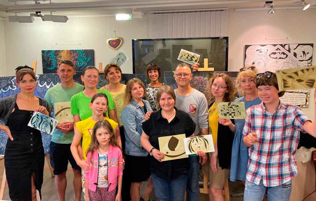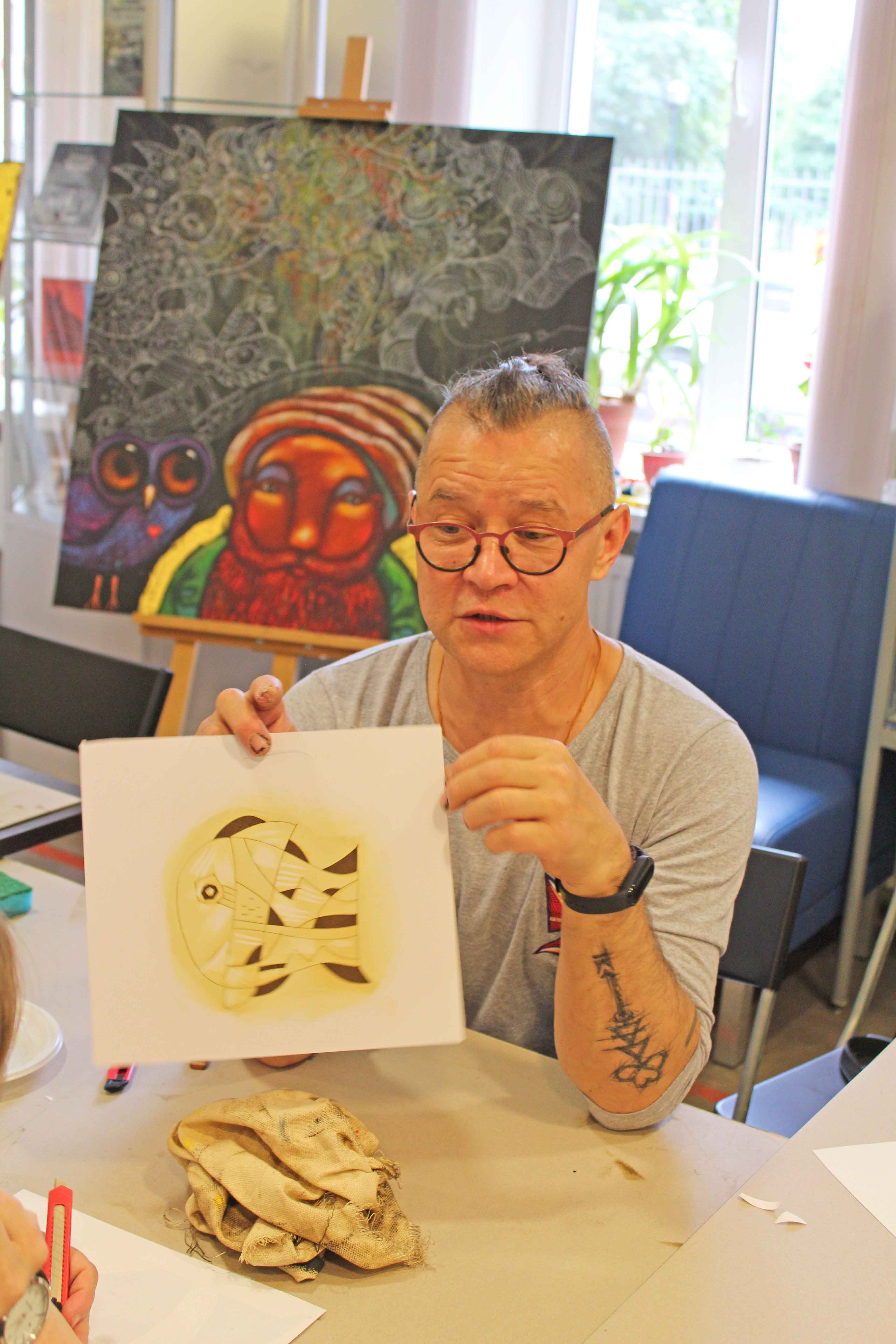 В рамках выставки «Сказки народа Водь» в библиотеке Кировских островов (Кемская ул. Д.8/3) 14 июля прошел мастер-класс Валериуса. Художник поделился уникальной техникой живописи – «Царапки» и презентовал свои иллюстрации к сборнику водских народных сказок, который будет издан в рамках проекта «Народ земли».