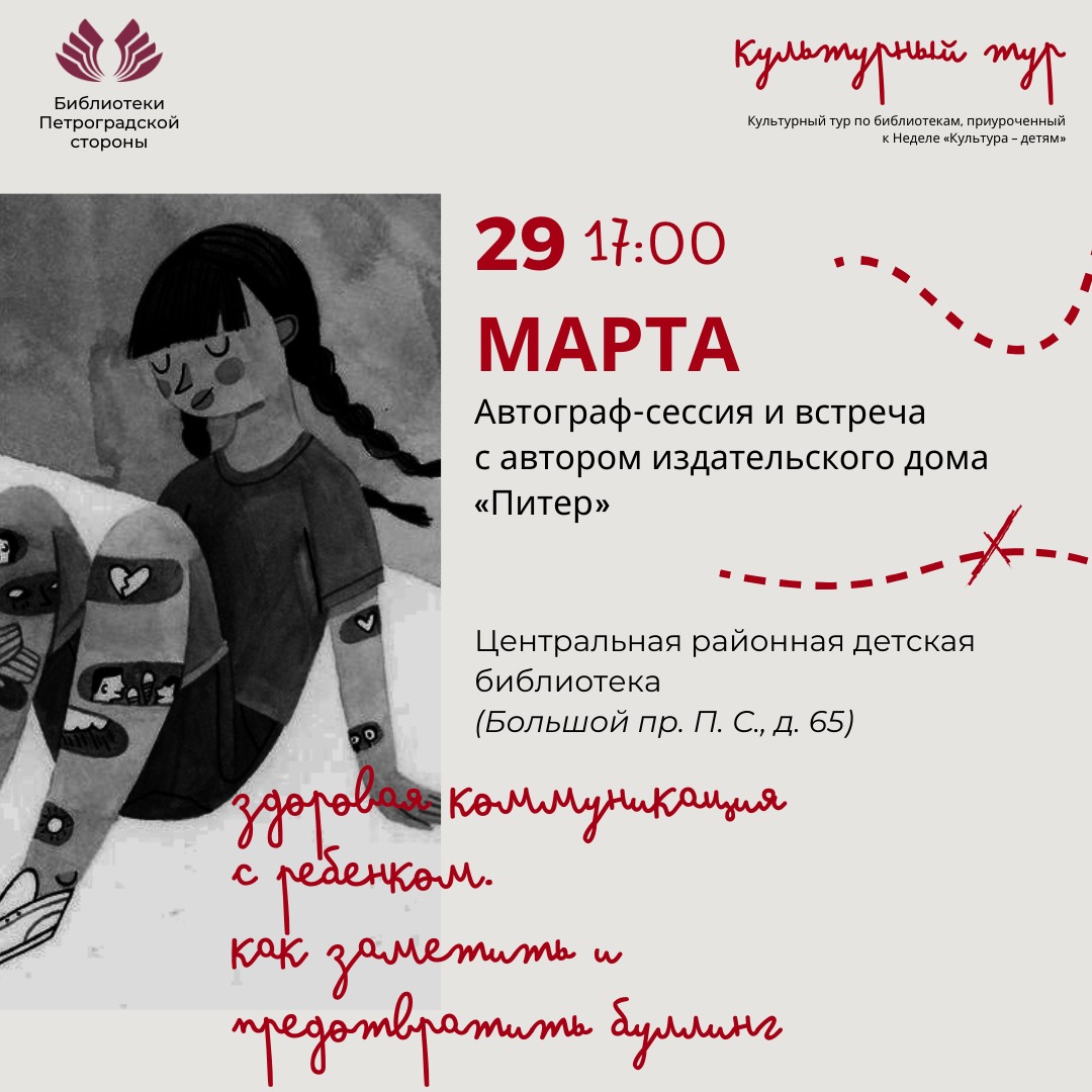 29 марта в 17:00 в Центральной районной детской библиотеке (Большой пр. П. С., д. 65) пройдёт автограф-сессия и встреча автора издательского дома «Питер» с родителями на тему «Здоровая коммуникация с ребенком. Как заметить и предотвратить буллинг» по книге Инги Сомс «Зябликова, не спи!».
