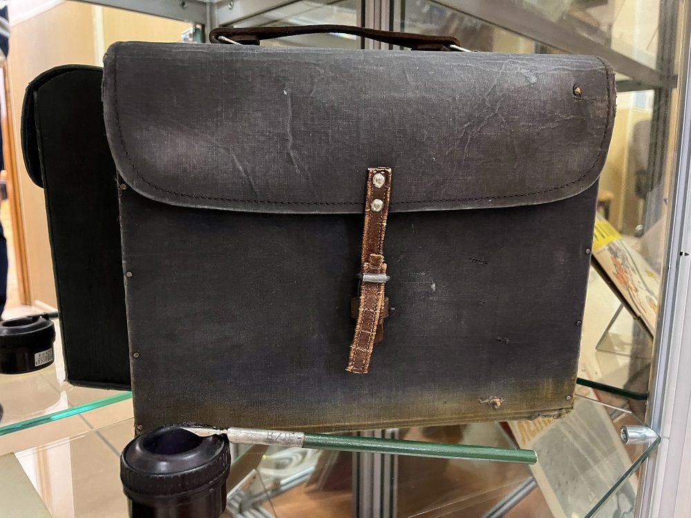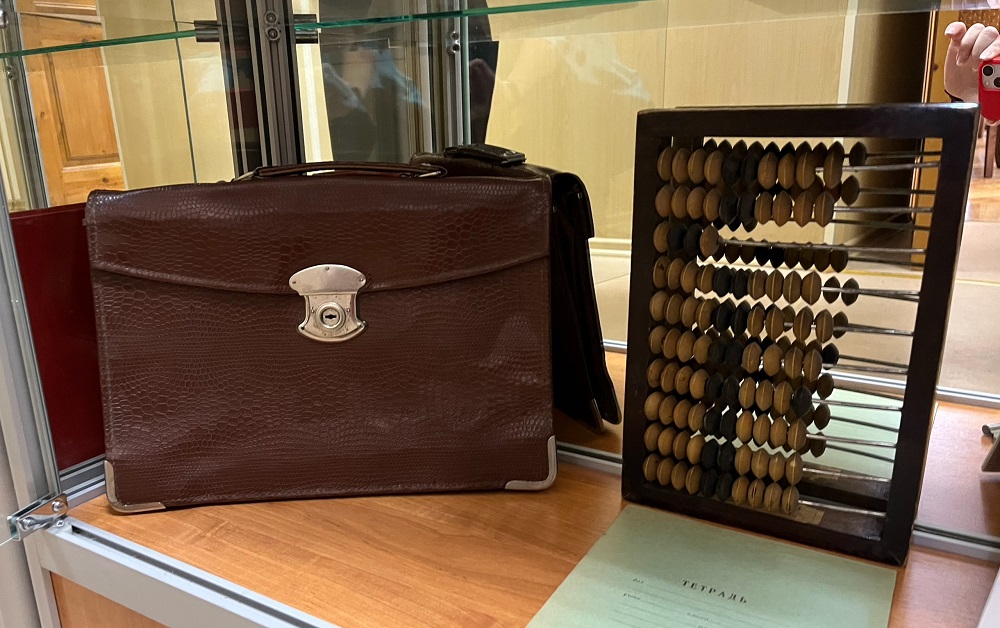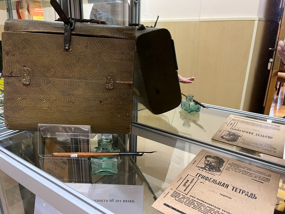 На экспозиции представлены школьные принадлежности начала ХХ века, середины ХХ века и 60-70 -х годов ХХ века. Портфели, тетради, ручки, чернильницы и другие редкие предметы. С такими портфелями ученики ходили в школу 120 лет назад.
