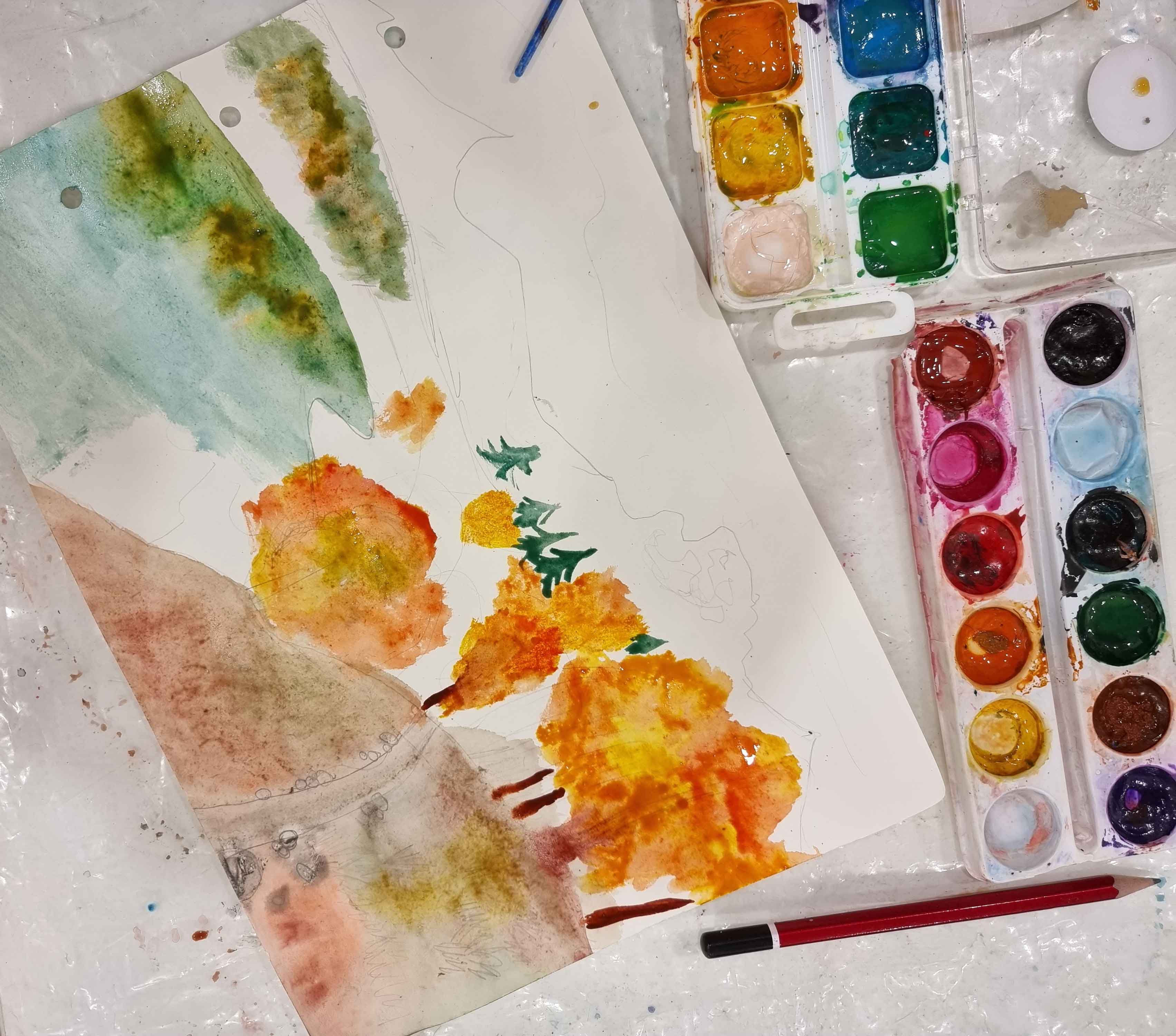 В ноябре мы осваиваем тему осенних пейзажей в акварели. Рисуя леса, поля, горы, водоемы – мы вместе учимся плавно работать с краской, ищем гармоничные сочетания цвета, учимся расставлять акценты в работе, масштабируем детали, играем с насыщенностью пигмента посредством добавления разного количества воды, пробуем различные техники нанесения краски.