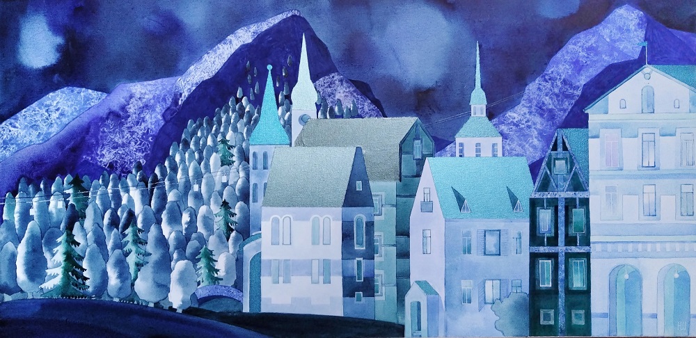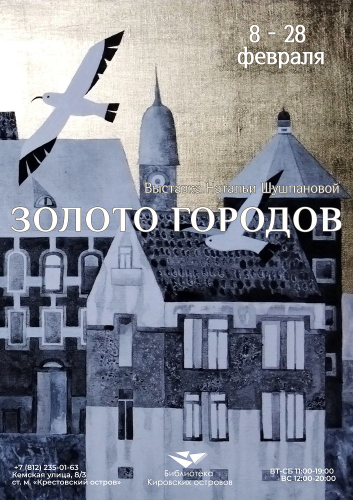 «Золото городов» — выставочный проект художницы Натальи Шушпановой, посвящённый поэзии городского пространства, который сейчас экспонируется в Библиотеке Кировских островов (Кемская ул., д.8/3).