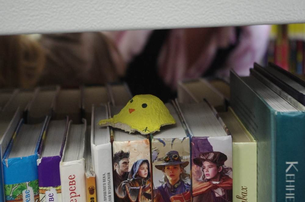 После основной части гости программы отправились в игру: дети попробовали «показать» чувства деревьев из рассказа: представить, как плачет ива, как дрожит осина, как замирает кипарис. Поиски пасхальных цыплят – следующее развлечение в программе. Они «спрятались» на книжных полках, и каждый участник получил задание найти своего желтенького героя.