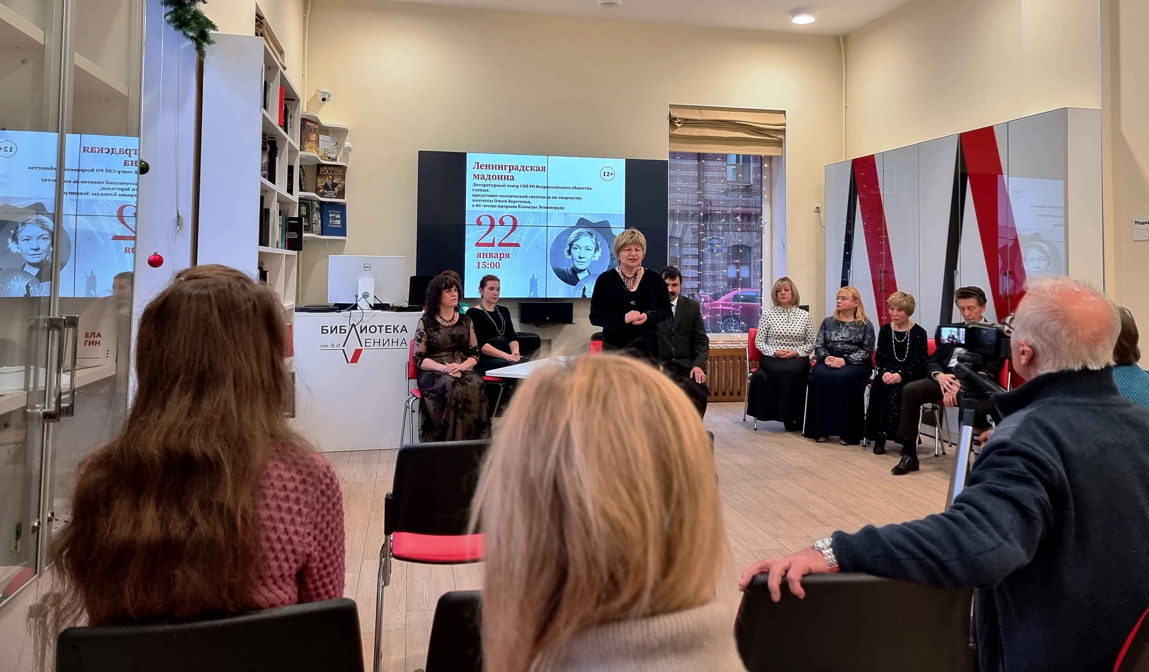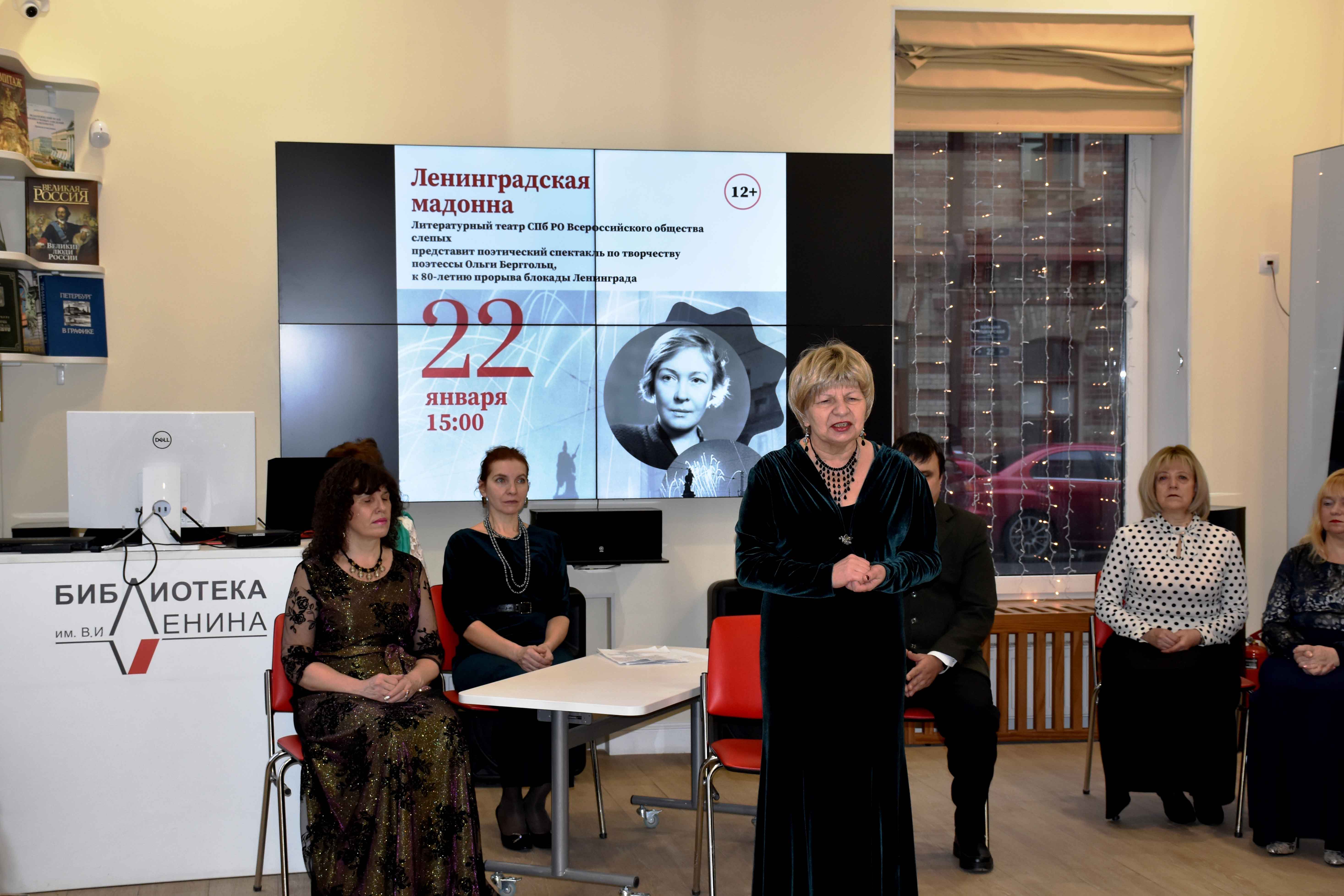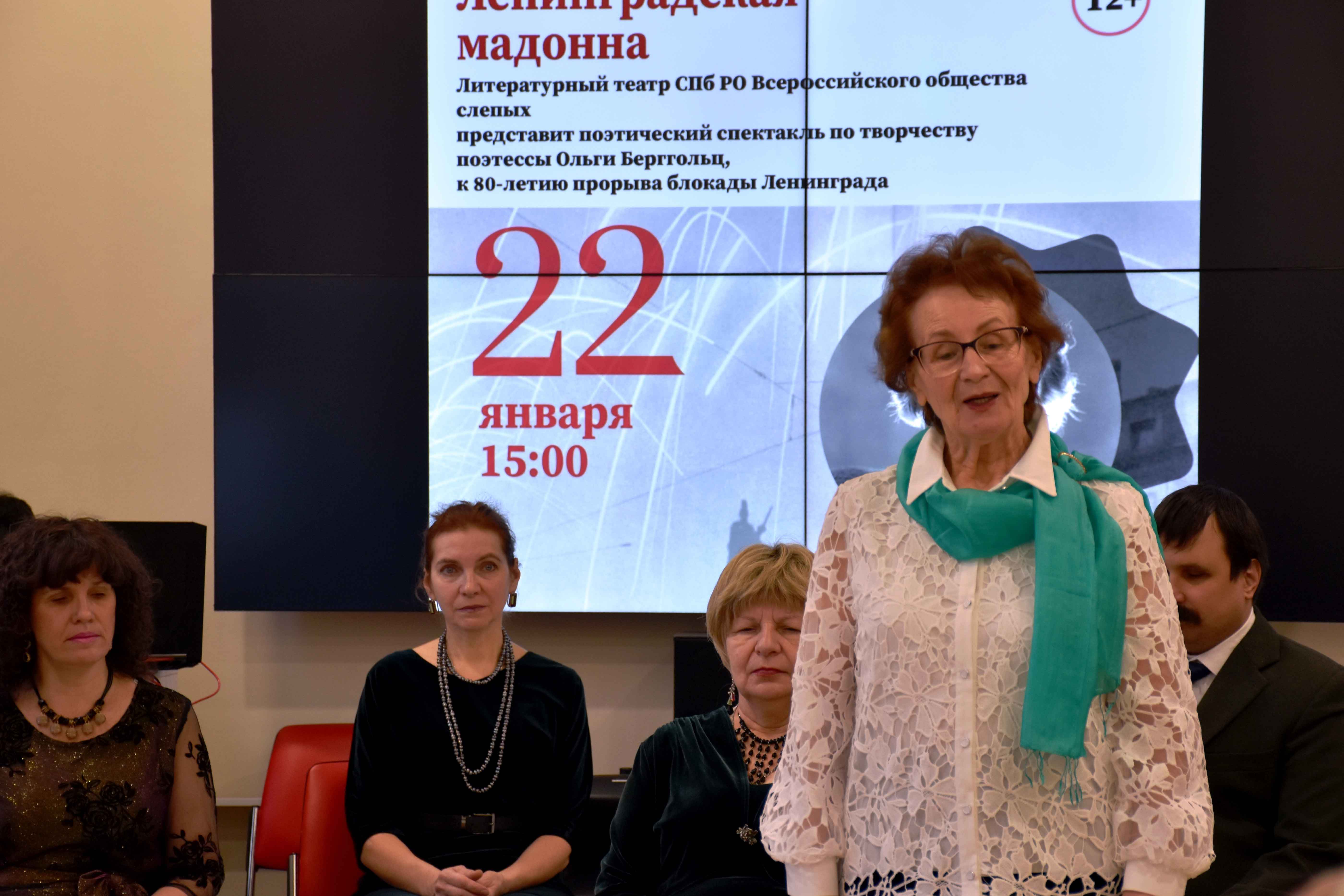 Отрывки из биографии О. Берггольц, ее стихотворения, посвященные блокадному Ленинграду, Победе в Великой Отечественной войне и самой жизни читали актеры литературного театра Санкт-Петербургской региональной организации Всероссийского общества слепых и слабовидящих.