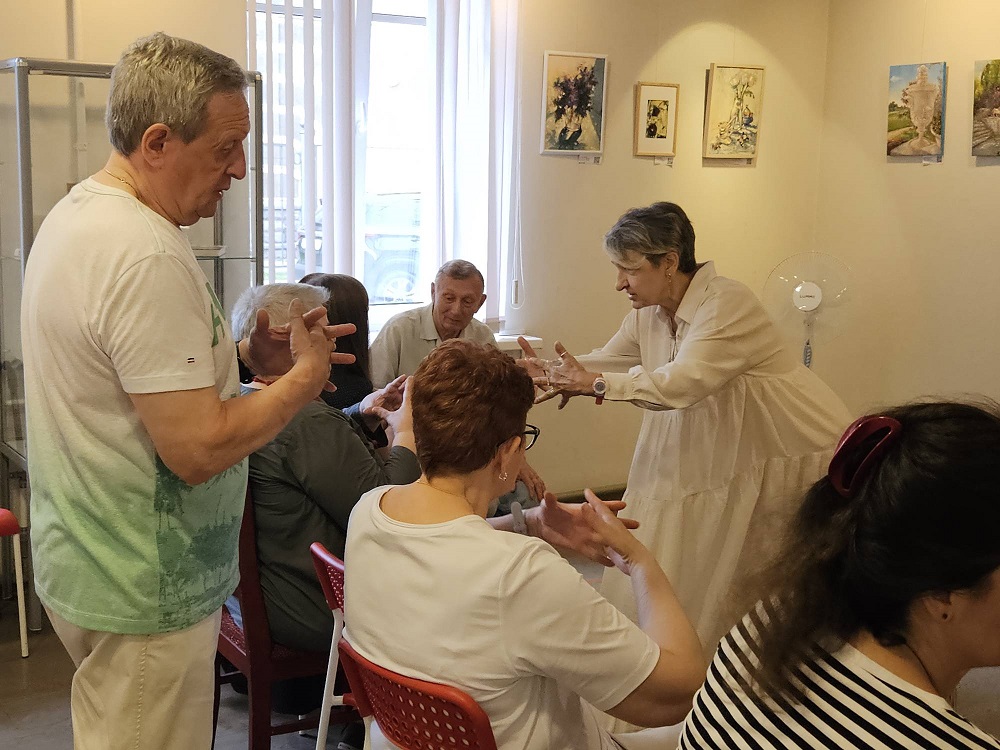 Традиционно встреча началась с чаепития и тёплого общения. Затем участники выполнили комплекс упражнений, направленных на профилактику когнитивных нарушений. Физическая активность, особенно связанная с движениями рук, положительно влияет на работу мозга, поддерживает память, внимание и общее самочувствие.