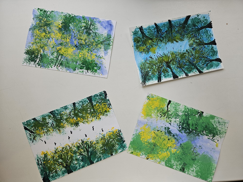 Не менее важную роль играет и творчество. Так, специалист библиотеки провела необычный творческий мастер-класс по рисованию. На этот раз рисовали деревья – взгляд сверху, словно мы лежим в лесу и смотрим вверх сквозь кроны. Рисование было необычным: листву создавали при помощи салфетки. Такая техника задействует мелкую моторику и творческое мышление, что благоприятно сказывается на когнитивной функции и эмоциональном состоянии участников.