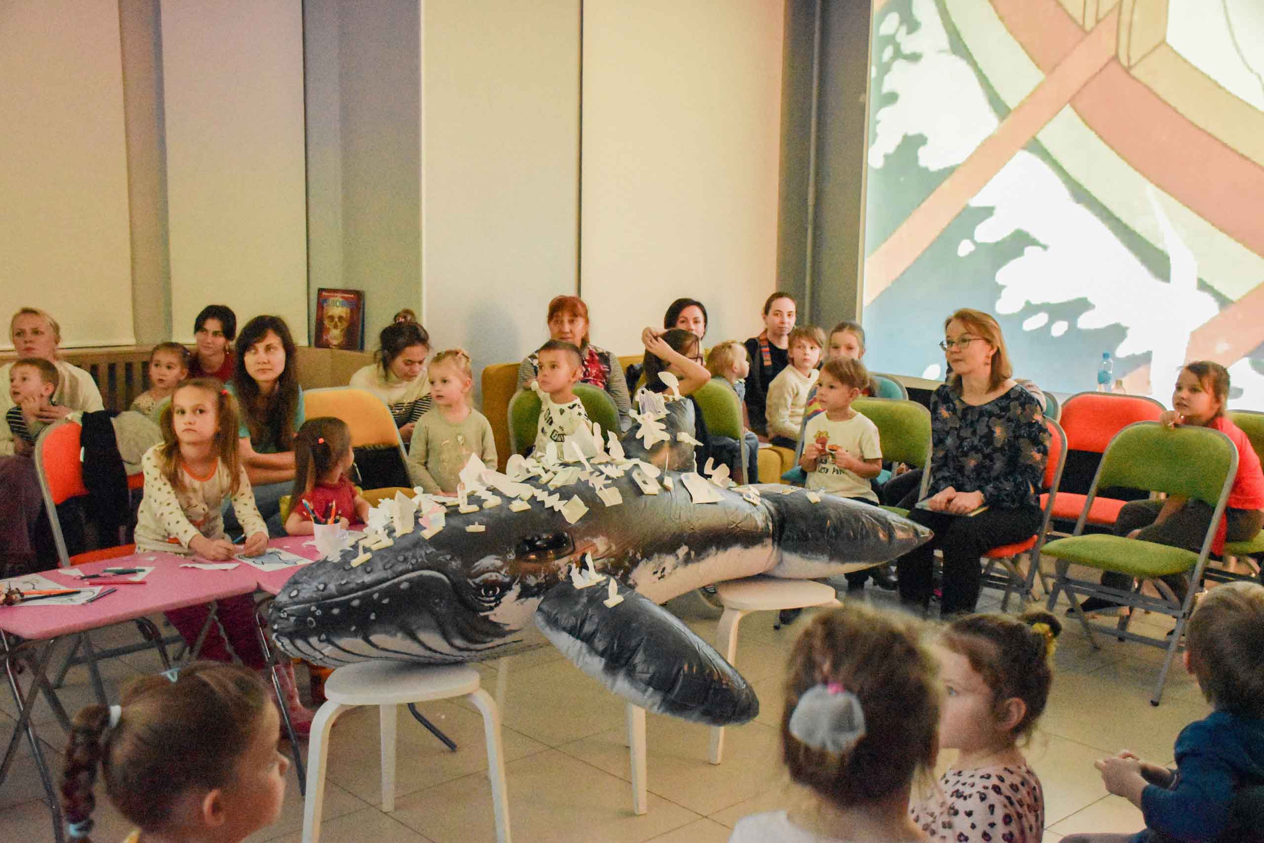 В этот раз к детям и родителям пришла в гости актриса театра Тамара Путрик и принесла с собою куклу-актера - того самого Конька Горбунка, который помогает Ивану в сказке на сцене, и который, кстати, является символом Театра Сказки на Московских воротах. Тамара показала чертеж и схему куклы-мыши и ее детали из прочного папье-маше и дерева. Но центром внимания всей аудитории стал кит, на спине которого буквально за пятнадцать минут была сооружена деревня, посажен лес и поселены разные жители. Дети вокруг мгновенно превратились в море и чаек, а кит поплыл по волнам! В очередной раз все убедились - для того, чтобы оживить сказку, достаточно в нее поверить!