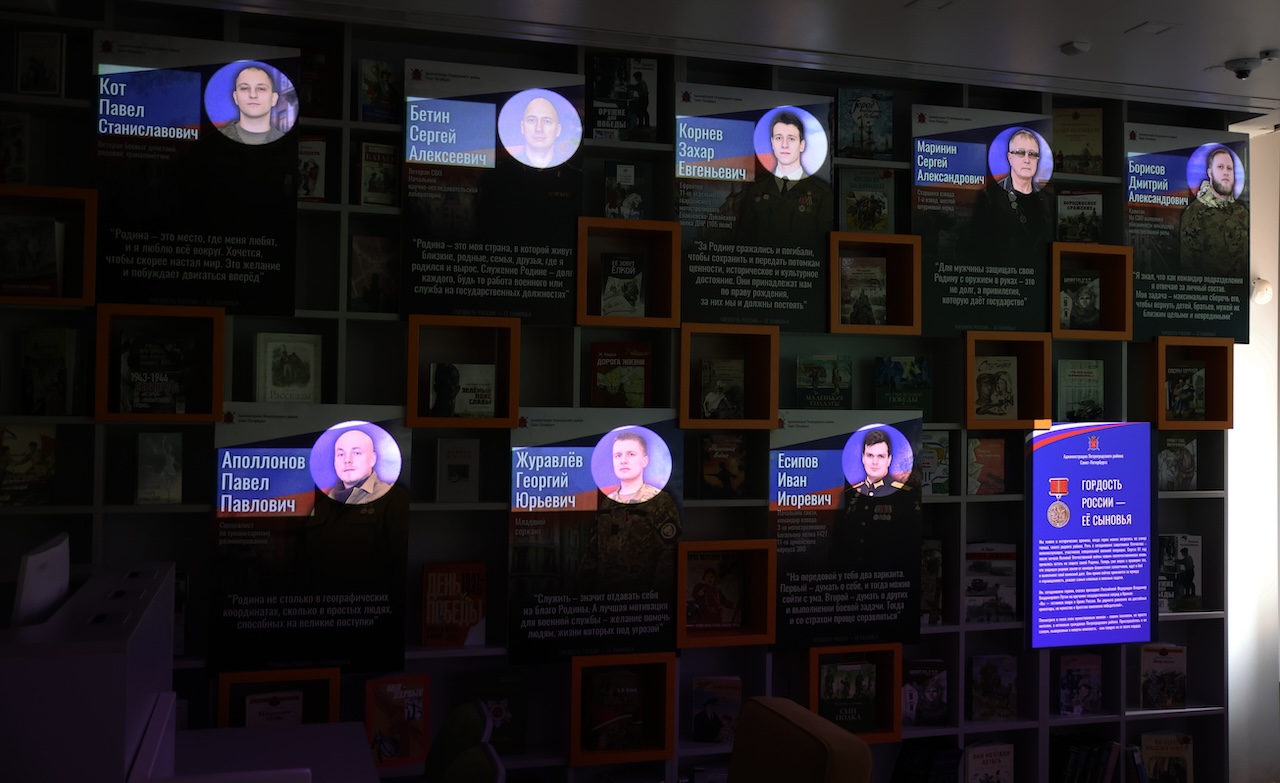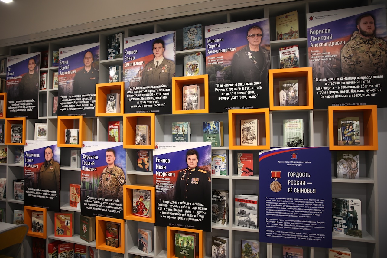 Гости познакомились с выставкой «Гордость России — её сыновья», посвящённой героям-участникам специальной военной операции. Выставка — это дань уважения и благодарности сегодняшним защитникам Родины. На ней размещены цитаты и фотопортреты героев, жителей Петроградской стороны, принимающих участие в специальной военной операции, оставивших свой след в истории нашей страны.