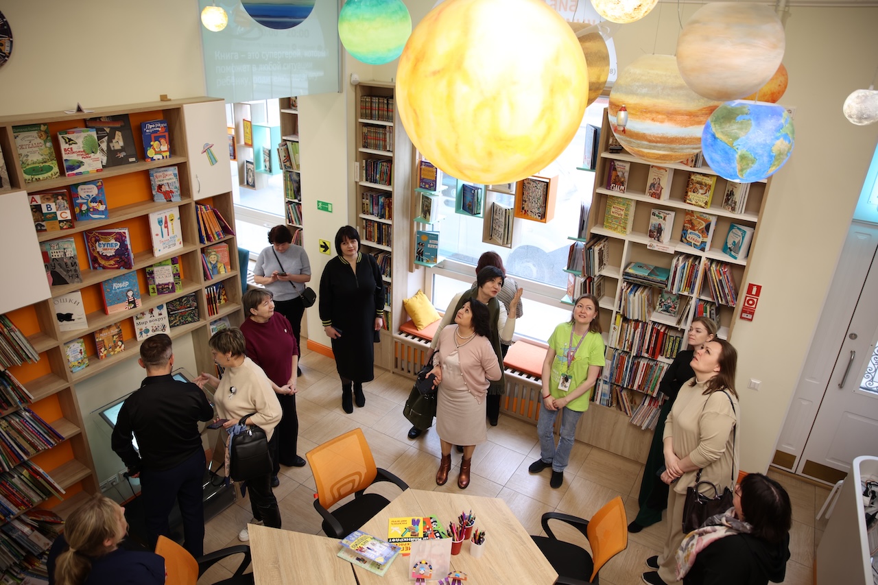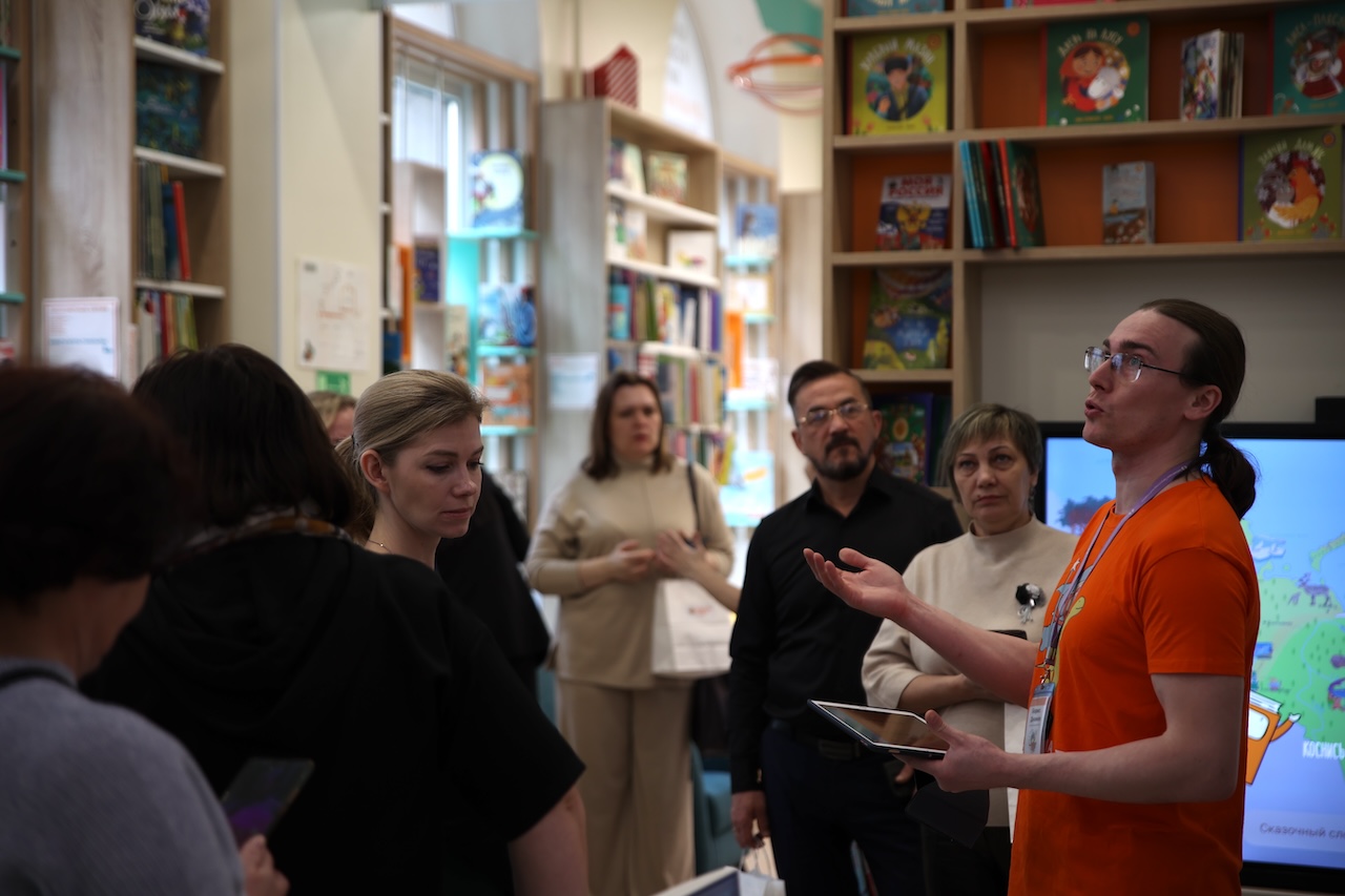 Заведующая отделом обслуживания Наталья Пархоменко провела для коллег экскурсию и познакомила с пространством инновационного Центра детского чтения. Особое внимание гостей из Нижегородской области обратили на интерактивные проекты библиотеки: экран с дополненной реальностью «В гостях у сказки», проект «Интерактивная карта России» и электронную книгу, в которой хранятся оцифрованные ретро-издания детской литературы.