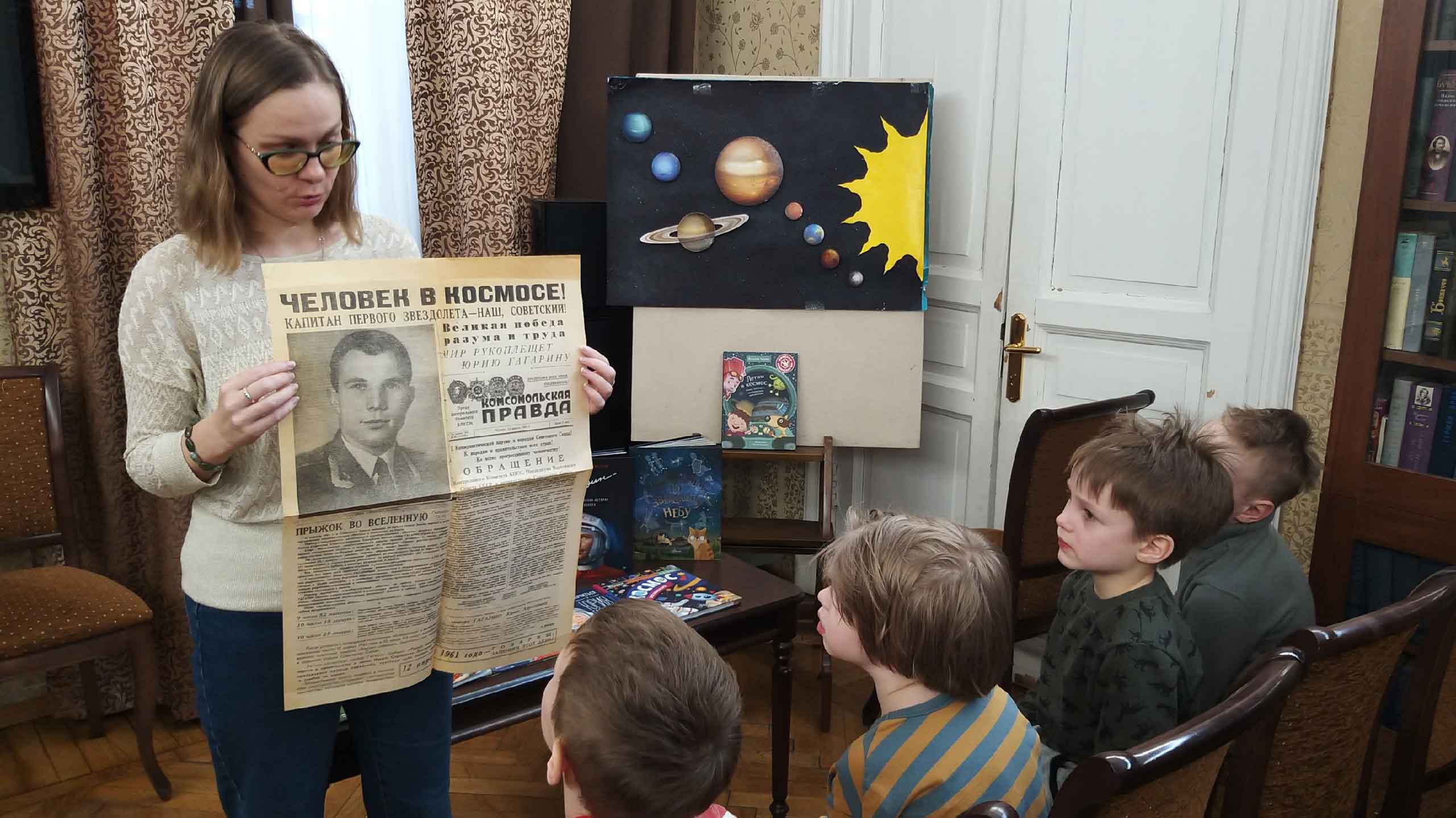 Дети увидели газету «Комсомольская правда» от 13 апреля 1961 года, в которой напечатана статья о первом полете в космос советского космонавта Юрия Гагарина. Не были забыты и Белка со Стрелкой — собаки-космонавты, совершившие космический полёт на советском корабле «Спутник-5» 19 августа 1960 года. Их полёт продолжался более 25 часов. Эти первые космические путешественники, которые благополучно вернулись из полёта. Их поселили в Московском зоопарке и обходились с ними как с героями.