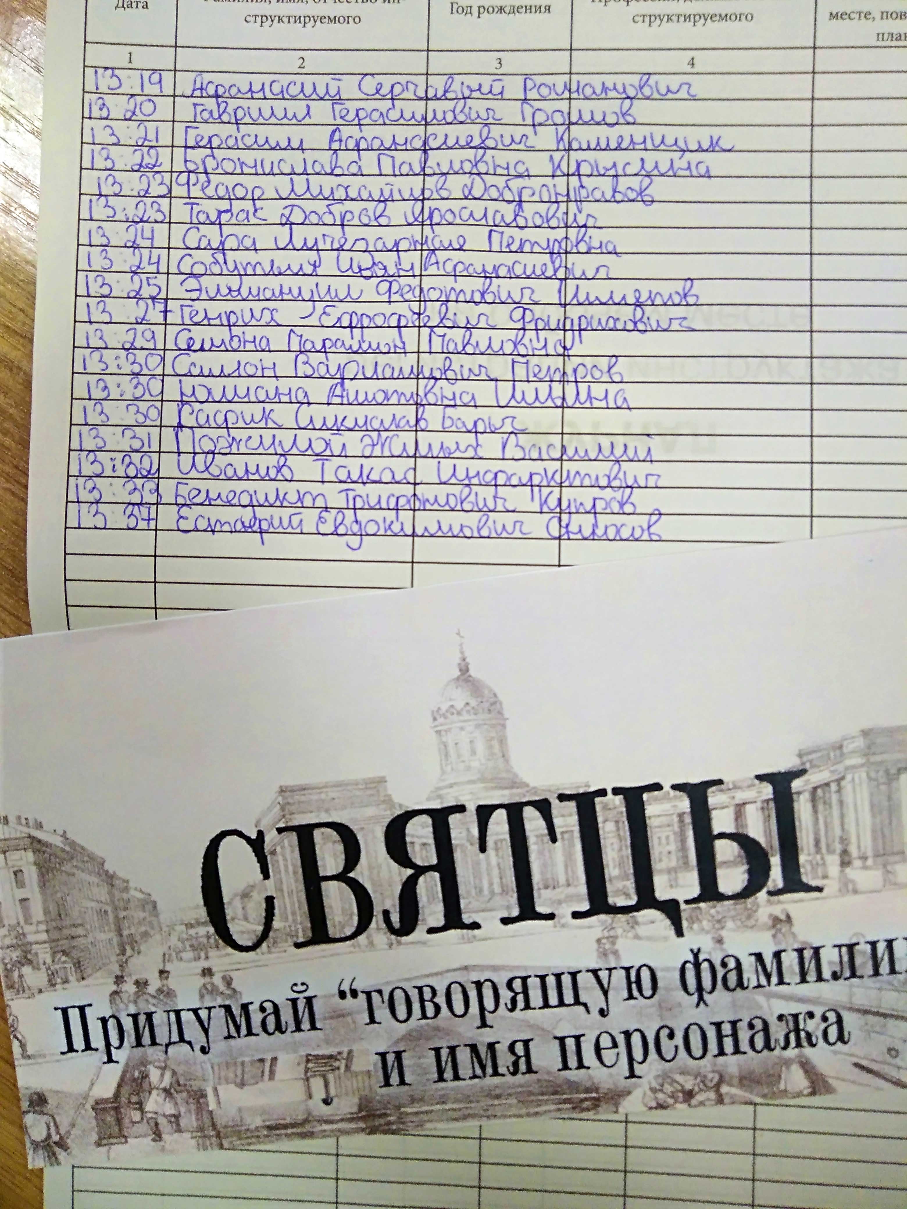 Имя персонажа будущей истории можно было получить за столом с адресной книгой. В обмен на придуманную «говорящую» фамилию выдавалось имя персонажа Гоголя. Семиклассники оказались не так просты – как вам, например, Бронислава Павловна Крысина или Тарас Инфарктович Иванов, которых они выдумали?