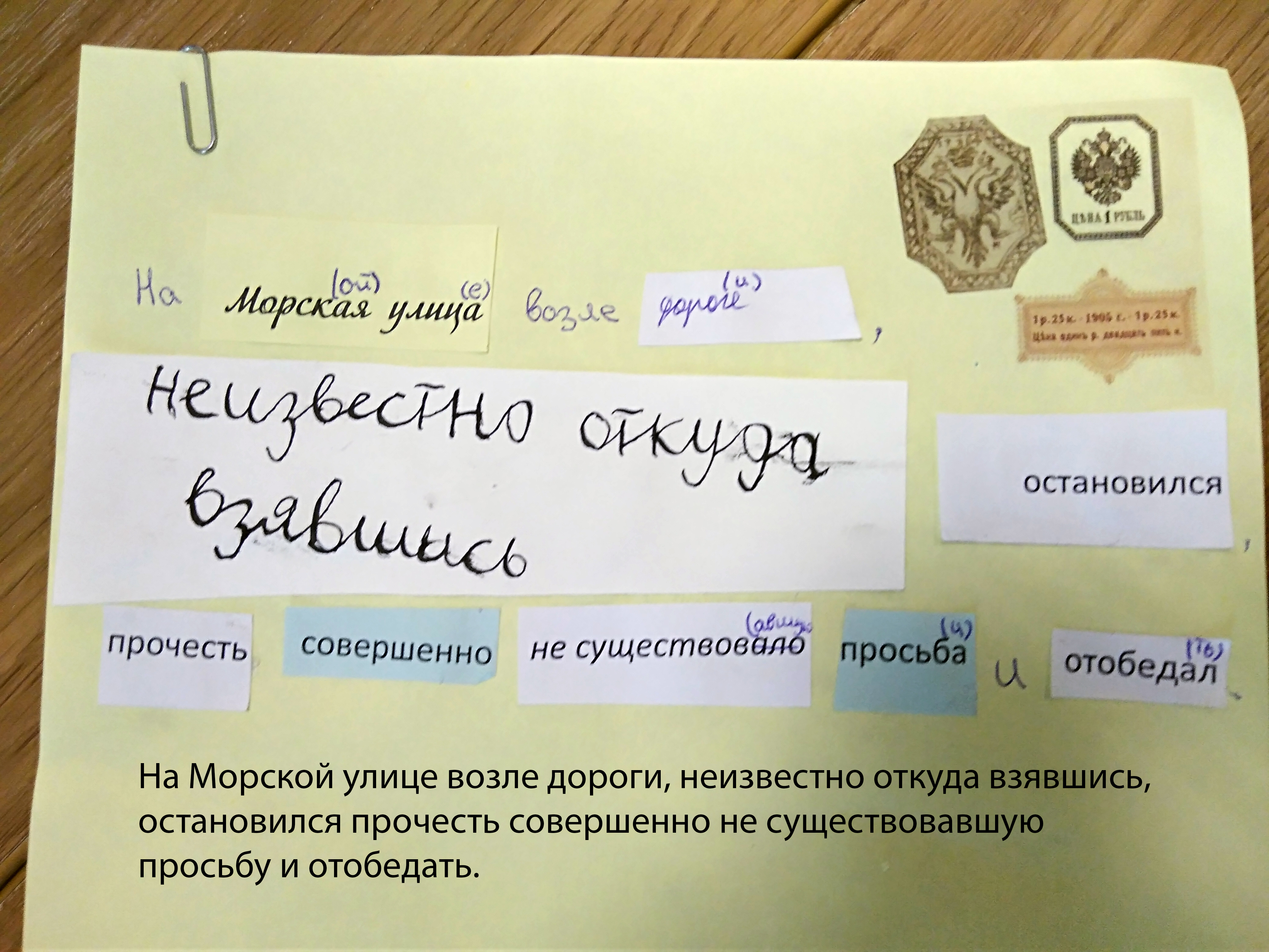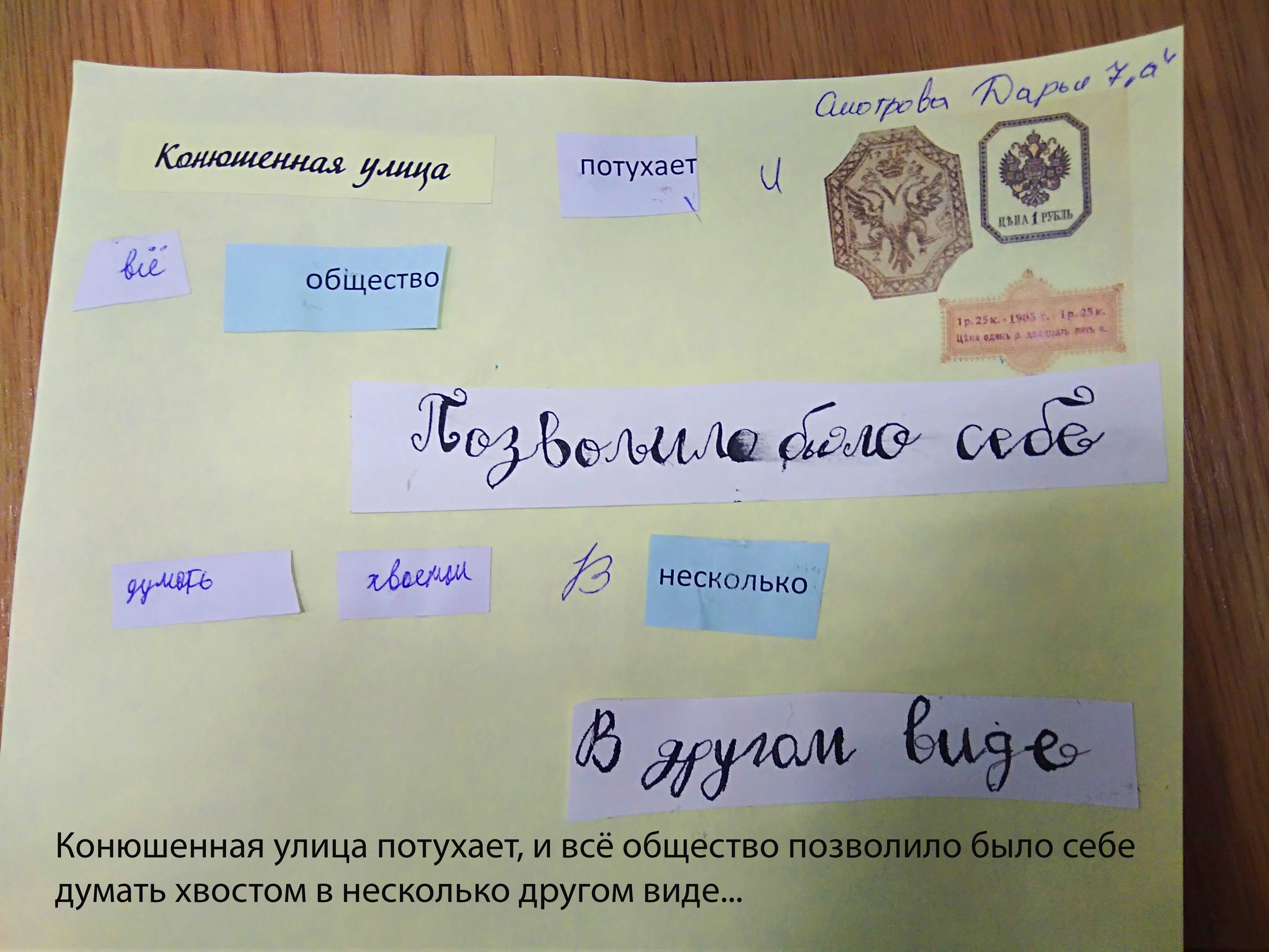 Каждый ученик в процессе игры получил свой набор слов, взятых в основном из «Шинели» с добавками из других «Петербургских повестей» Н.В. Гоголя. Но так ли легко было получить эти слова? Каждое из них нужно было заработать в импровизированном городе XIX века и затем составить собственный текст на «гербовой бумаге».