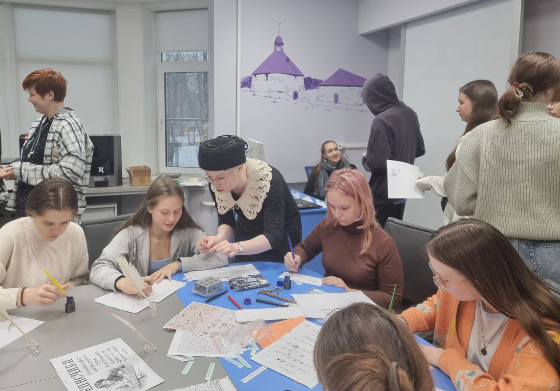 Учащиеся интенсива познакомились с методикой проведения литературной игры и смогли сами сыграть в неё – вспоминали «говорящие» имена из произведений Гоголя, учились писать пером и тушью, объясняли устаревшие слова и составляли собственный текст из слов Гоголя.