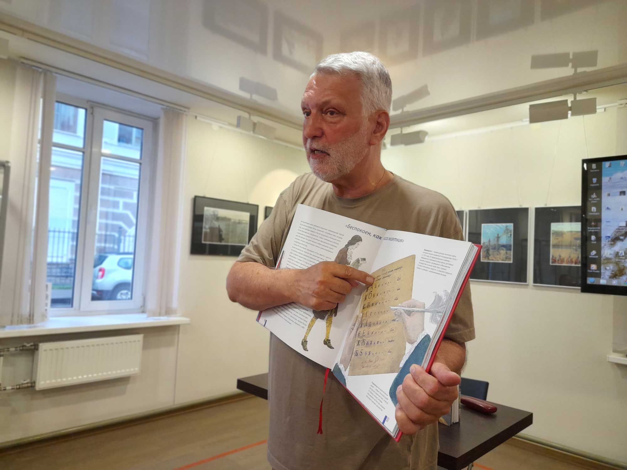 Сотрудники библиотеки Кировских островов поговорили с Михаилом Абрамовичем о выставке, иллюстрировании книг, интересных открытиях во время подготовки к работе и важности детских книг.