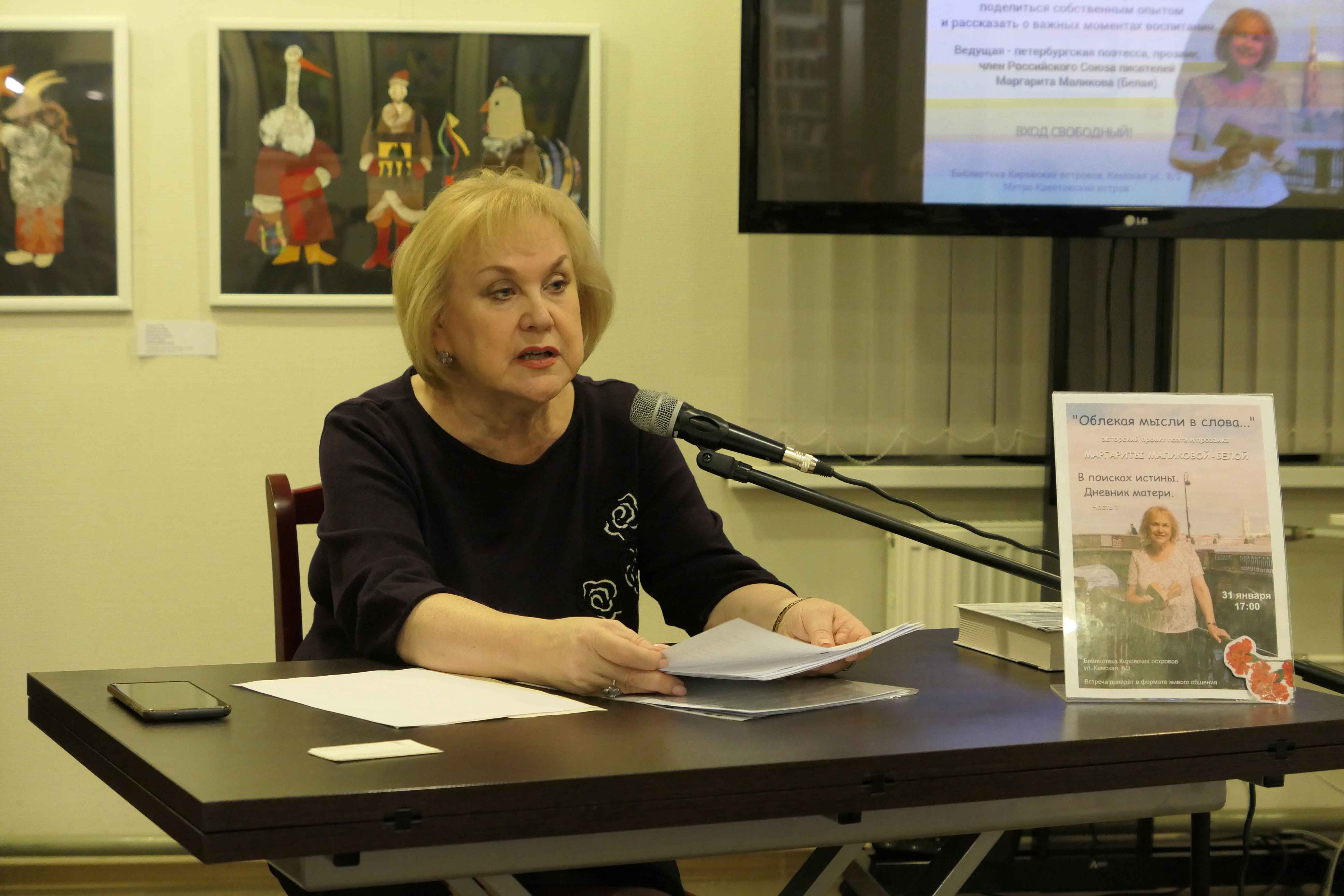 Этой теме была посвящена творческая встреча «В поисках истины. Дневник матери» с петербургской поэтессой, прозаиком Маргаритой Маликовой (Белой), состоявшаяся в библиотеке Кировских островов (Кемская улица, 8/3).