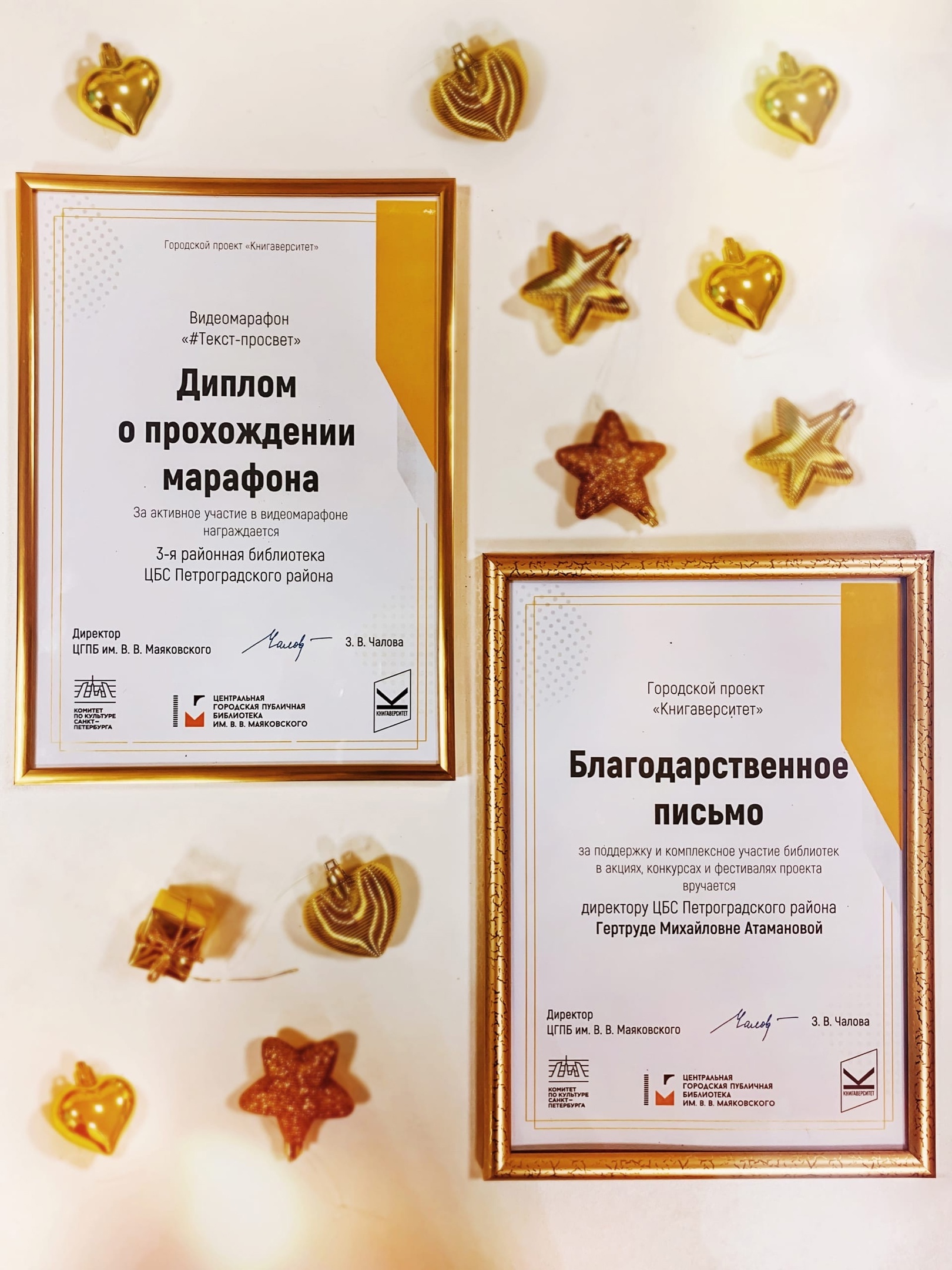Библиотека на Троицкой площади (3-я районная) отмечена дипломом за активное участие в видеомарафоне «Текст-просвет». Сотрудники библиотеки весь год участвовали в марафоне, снимая ролики про писателей-юбиляров. Ролики можно найти в группе библиотеки под хештегом #текстпросвет.