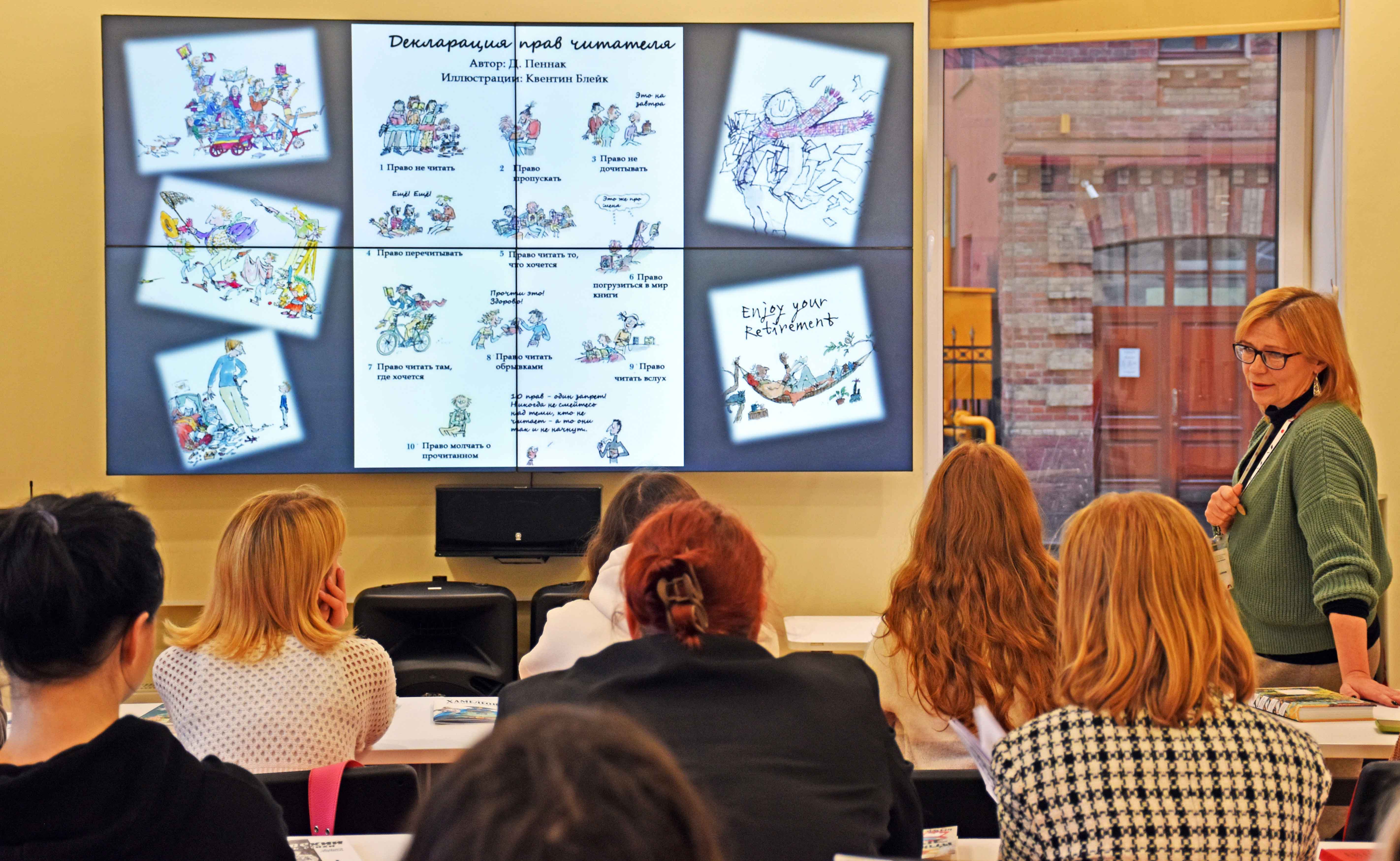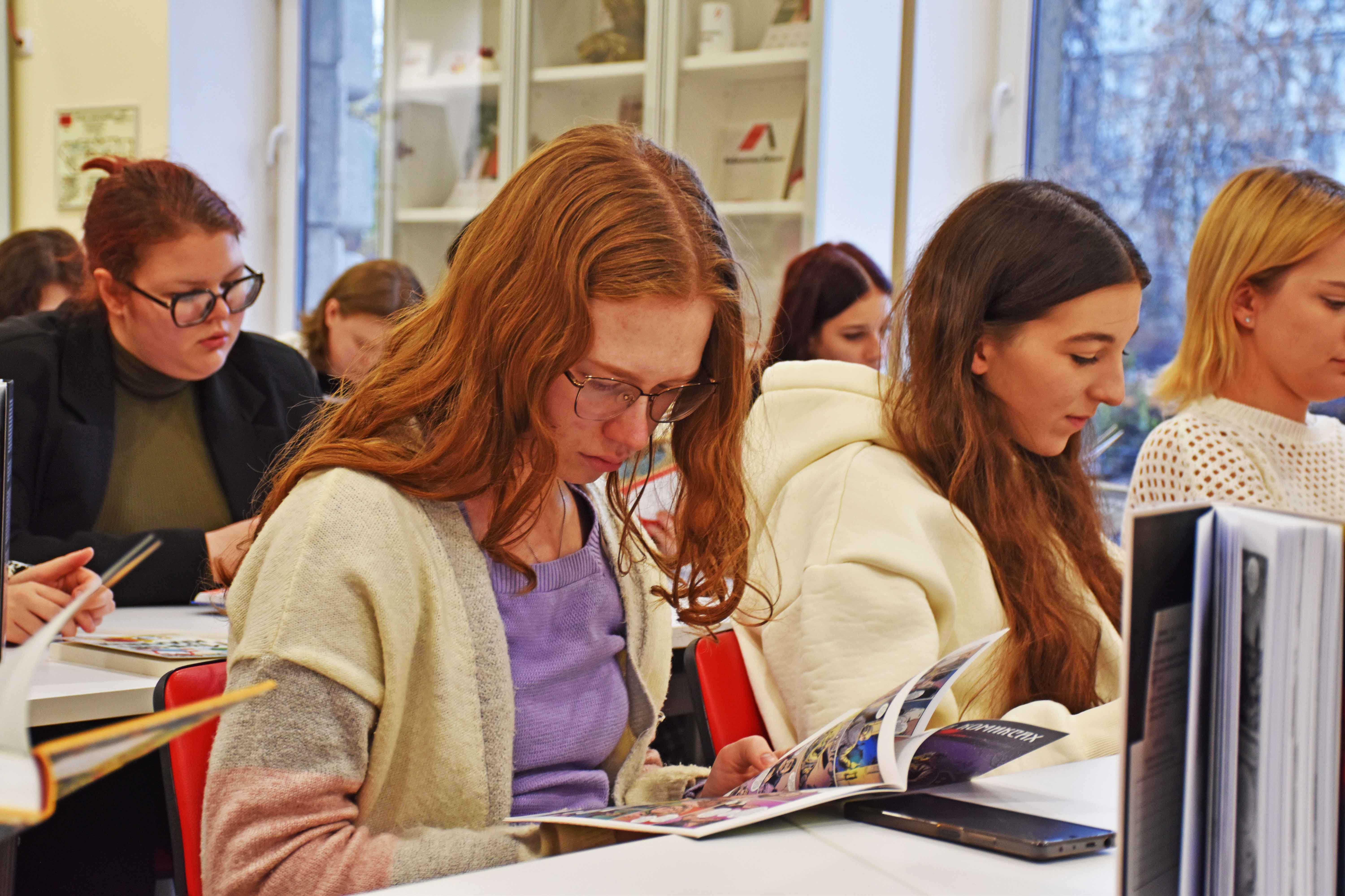 Особое внимание обращали на «книги о книгах», ведь для будущих издателей очень важно быть в курсе истории книгоиздания и современных тенденций. Страницы из «Booklover. Иллюстрированный путеводитель» Джейн Маунт никого не оставляют равнодушным: ну как не умилиться котикам – обитателям книжных магазинов в разных частях мира. Совершив стремительное плавание с книгой Елены Кузнецовой «От Одиссея до Гарри Поттера. Наглядная навигация по морю литературы», участники обратились и к самым актуальным художественным произведениям. Это были самые разные – маститые и не очень – авторы, самые интересные и значимые тексты на очень разнообразные темы. Читателей особенно заинтересовали графические романы, такие как «Дневник Анны Франк» Ари Фольмана и Дэвида Полонски, «Сибирские хайку» Юрги Виле и другие. Очень интересный опыт «осмысления» школьной программы по литературе в повести Елены Клишиной «Спойлеры», конечно, вызывал много улыбок у слушателей.