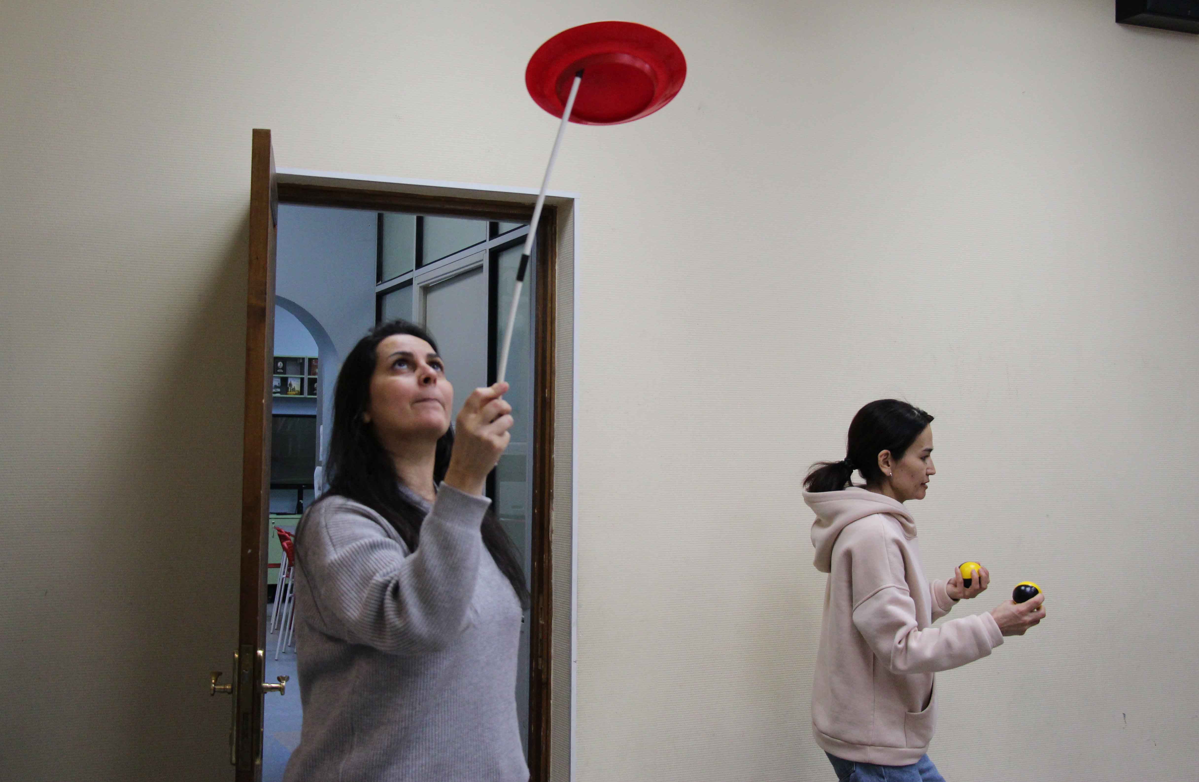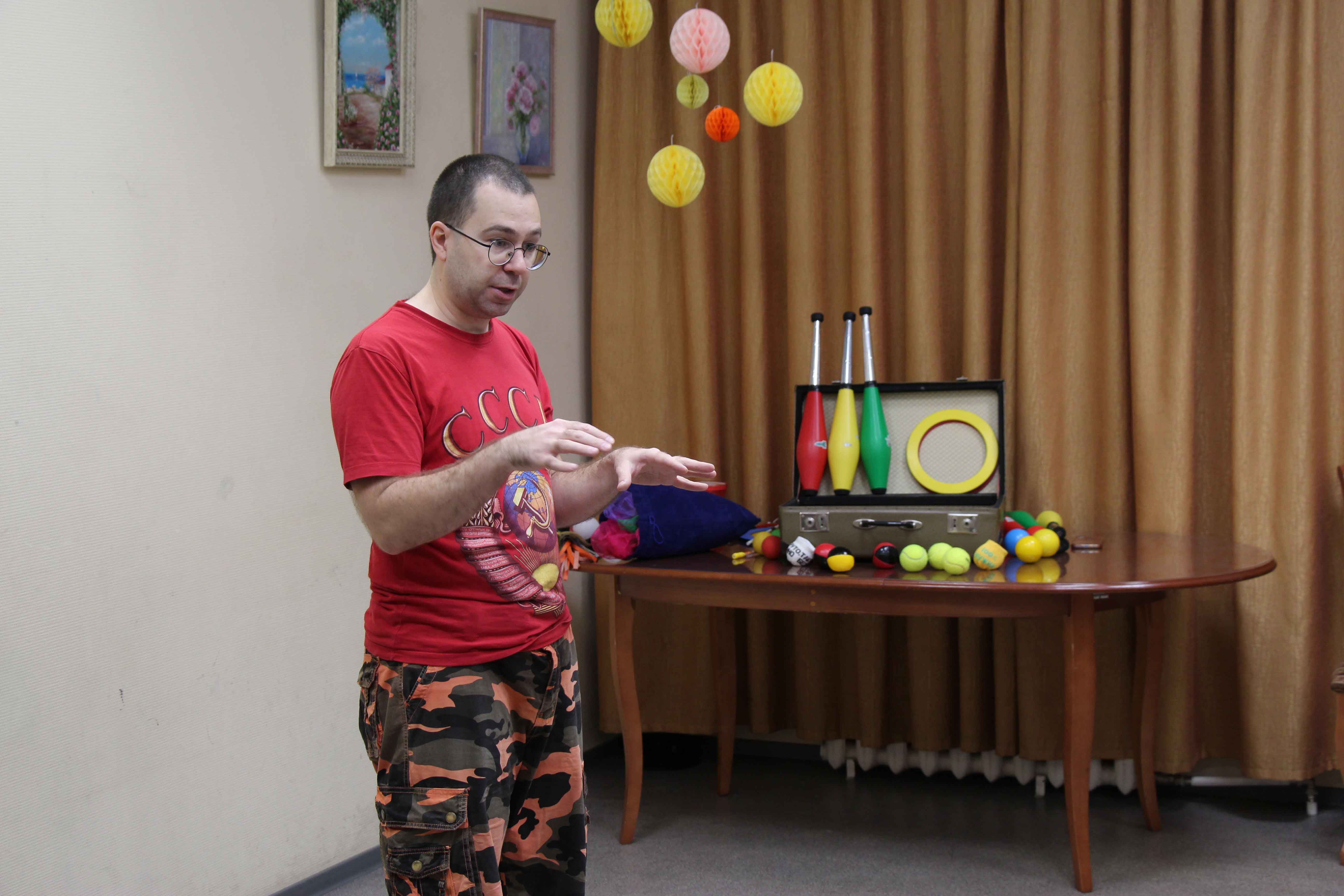 Олег рассказал о том, какие существуют виды жонглирования, продемонстрировал множество различных техник, извлекая из принесённого с собой чемодана, как из шляпы волшебника, всевозможный реквизит. К удивлению участников, оказалось, что, несмотря на свою лёгкость, для жонглирования подходят даже самые обычные полиэтиленовые пакеты или шейные платочки.