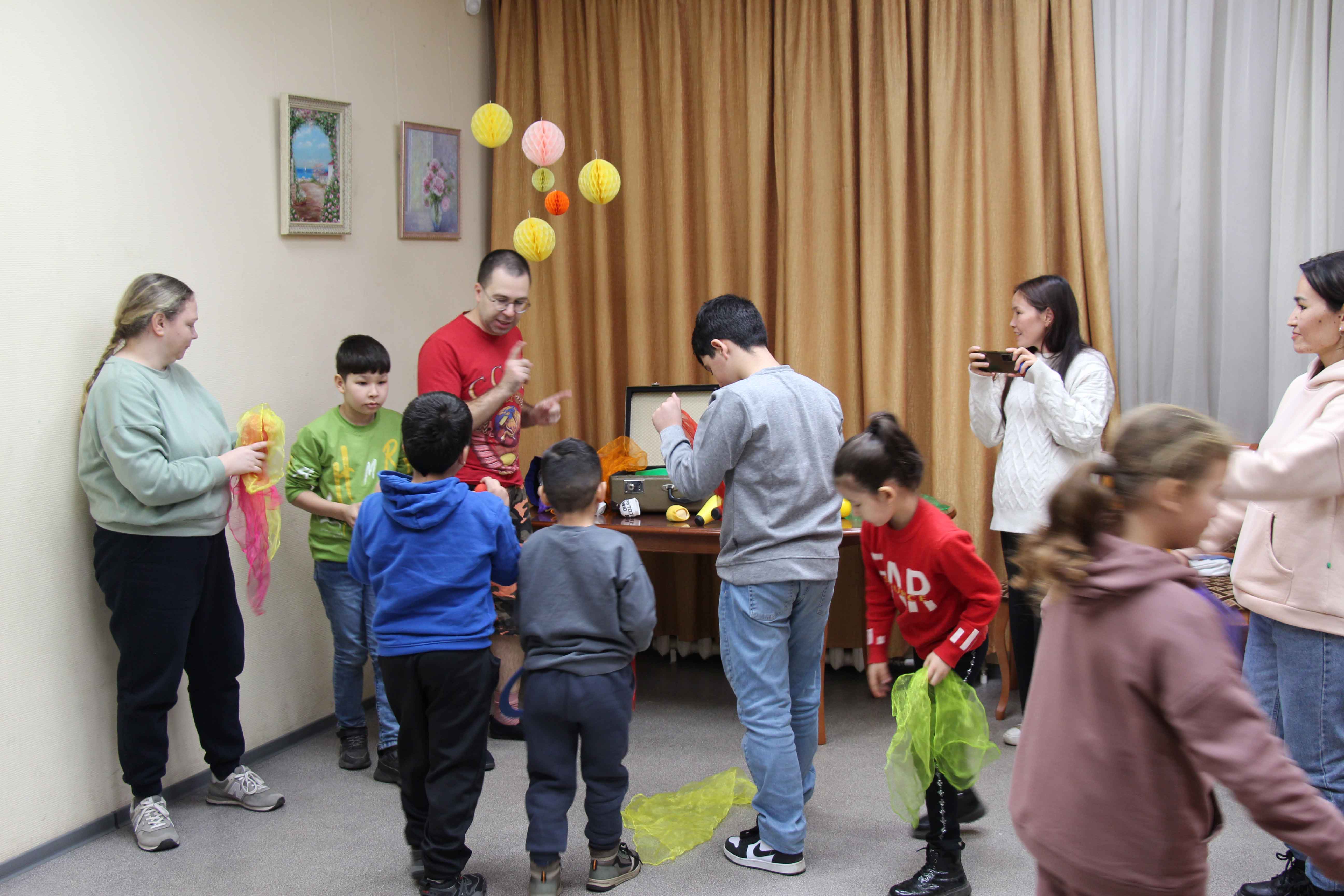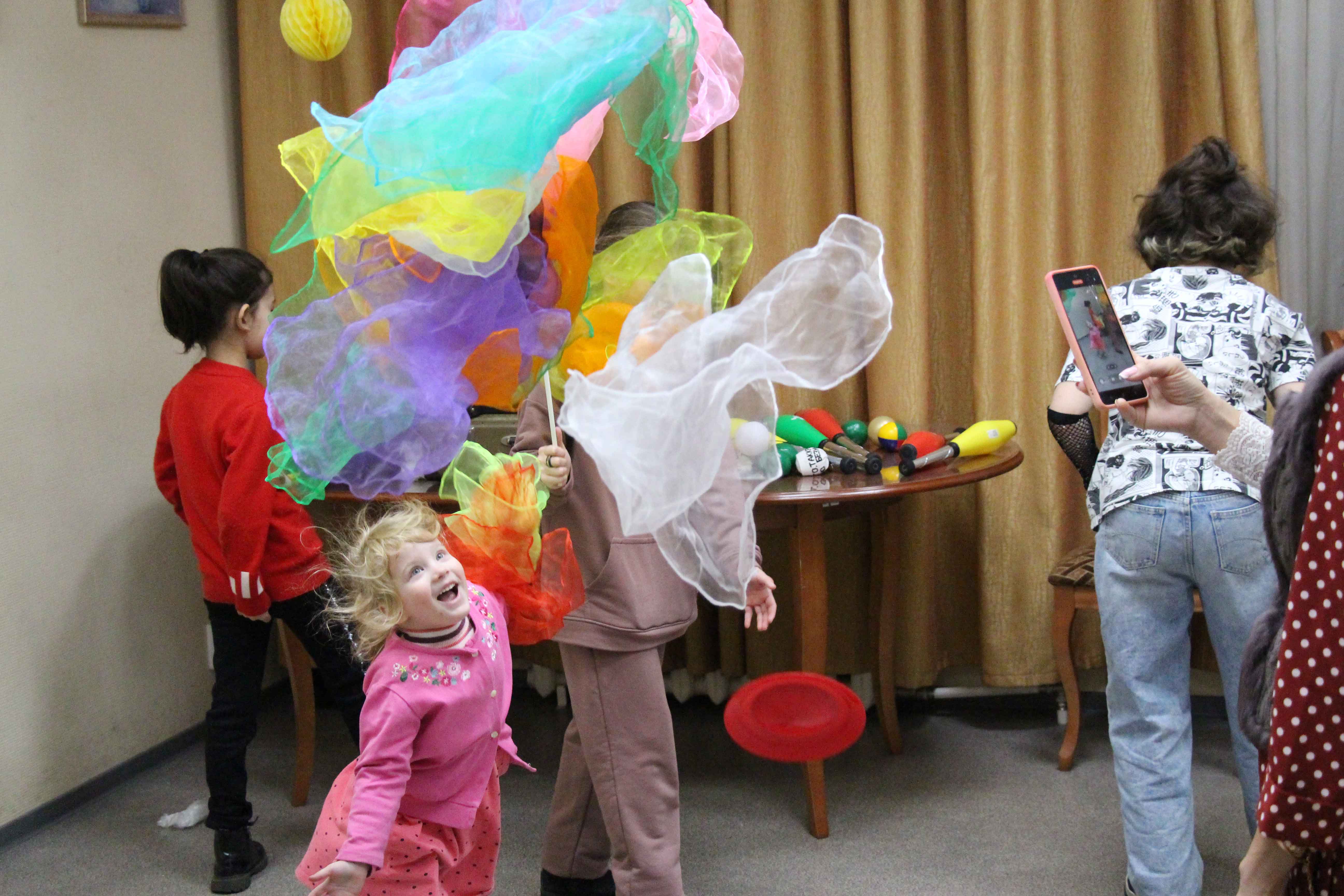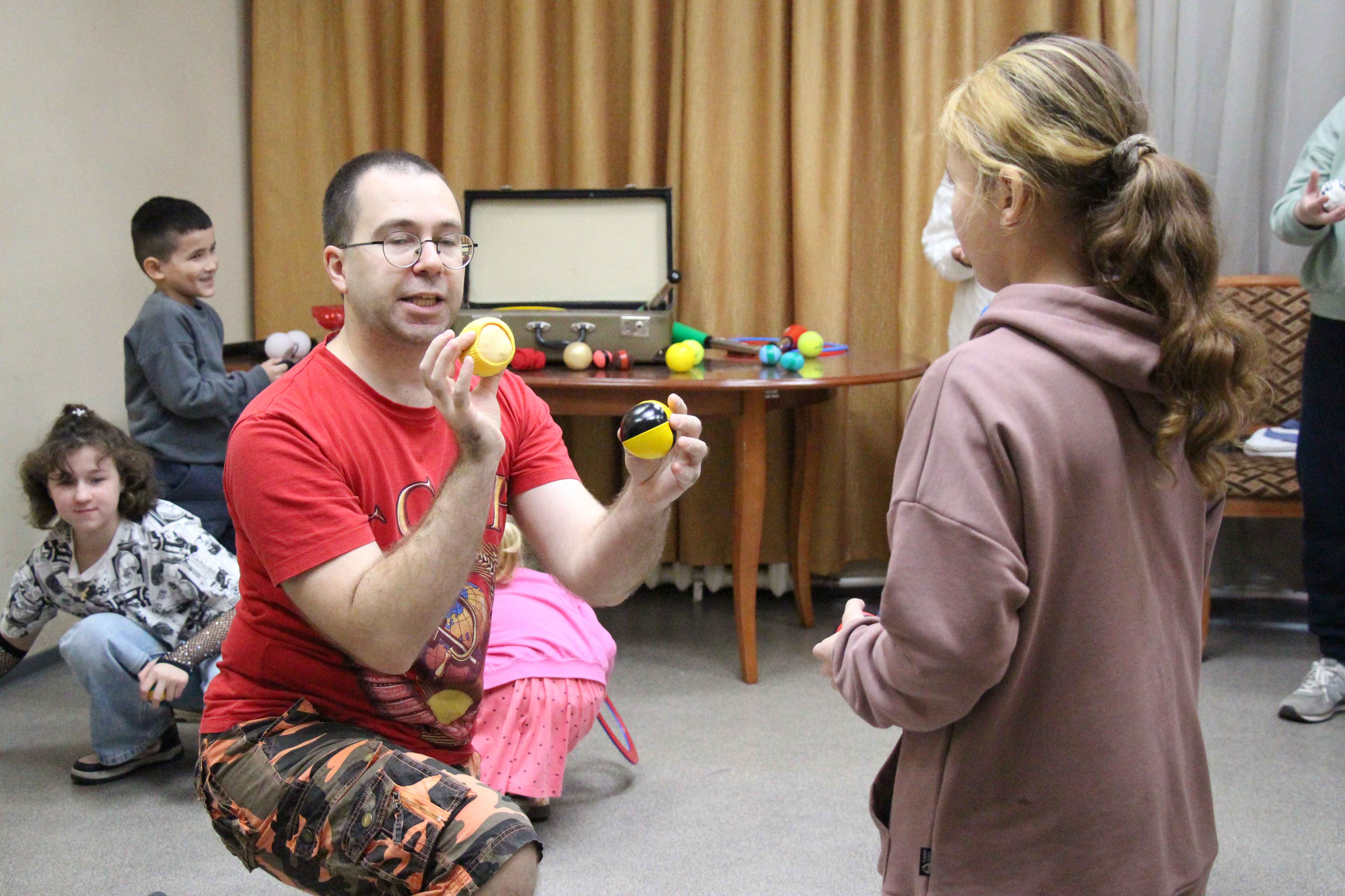 А потом всех ждал увлекательный и весёлый мастер-класс, во время которого каждый желающий мог выбрать любые предметы из чемодана Олега и попытаться ими жонглировать. Поначалу только дети с азартом и смехом вооружились мячиками, платочками, булавами и кольцами, пытаясь перехватывать их руками, как показывал Олег. Но очень быстро к ним присоединились и взрослые, с не меньшим удовольствием взявшись за дело. На лицах всех участников мастер-класса играли улыбки, а зал библиотеки наполнился смехом и радостными возгласами.
