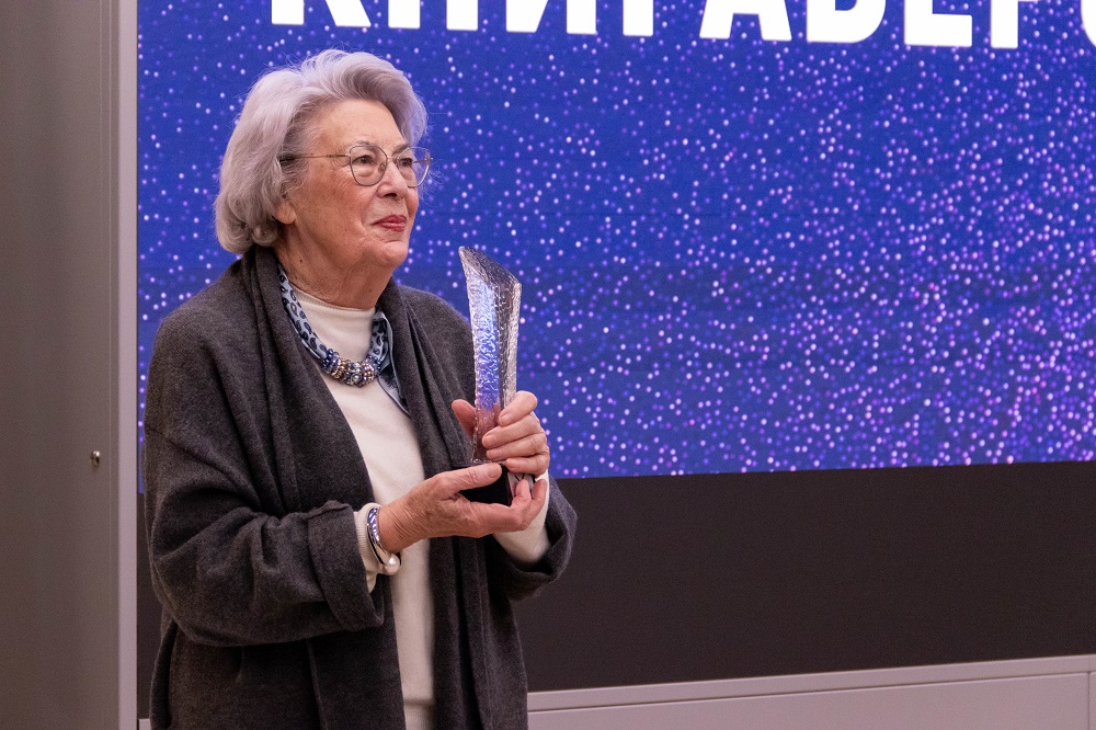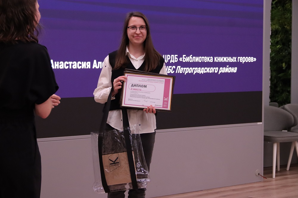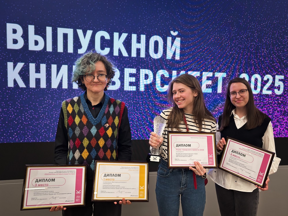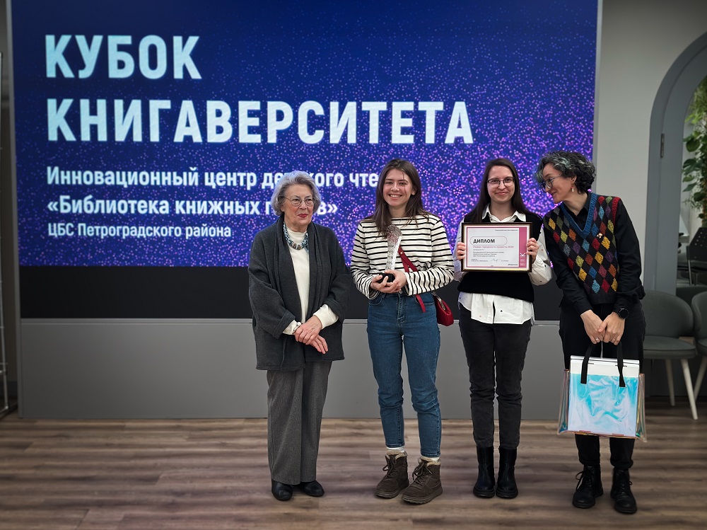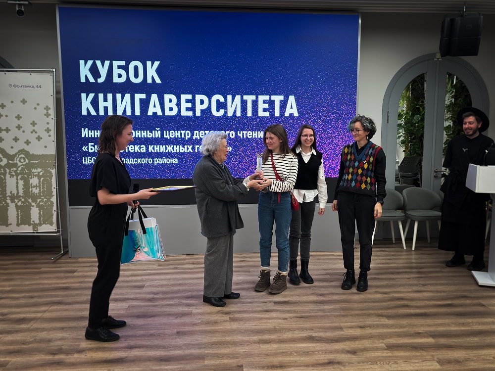 По итогам участия во всех фестивалях и конкурсах Книгаверситета-2025 лидером проекта стала Библиотека книжных героев (ул. Ленина, д.20). Переходящий хрустальный кубок и диплом «Лидера городского проекта 2025» победителям вручила Зоя Васильевна Чалова, директор ЦГПБ им. В. В. Маяковского и Президент Петербургского библиотечного общества.