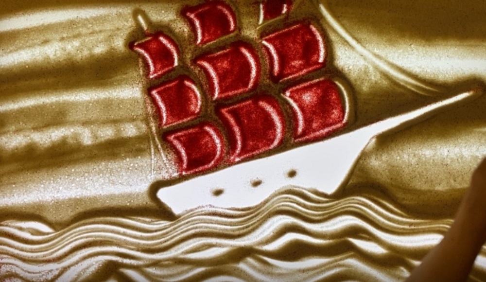 Вначале мы увидели рыбацкий городок Каперна, познакомились с маленькой Ассоль, у которой есть одна большая мечта. Затем песочная картина превратилась в комнаты дома юноши Грея, который мечтает о море. Спустя время, как и в сюжете книги, герои книги встретились! А вскоре у берегов своего города Ассоль увидела корабль Грея «Секрет» с теми самыми алыми парусами. Для большего эффекта художник использовала цветной песок. Влюбленные встретились на борту «Секрета» и уплыли, оставляя позади себя прошлое.