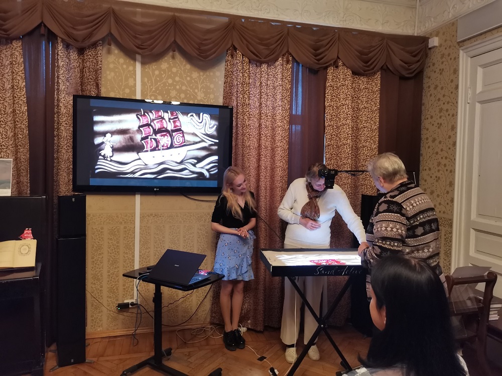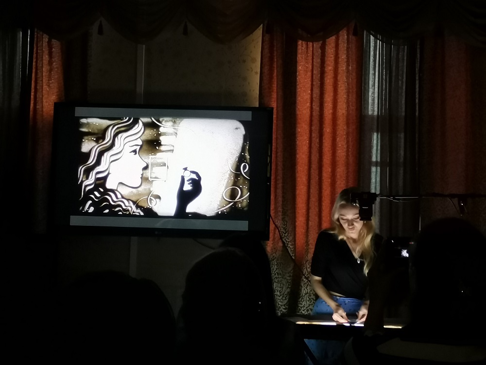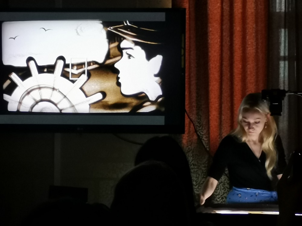 Гости мероприятия смогли увидеть экранизацию знаменитой на весь мир истории любви Ассоль и Грея. Сказочную историю из песка подготовила библиотекарь и художник Алина Корсунская.