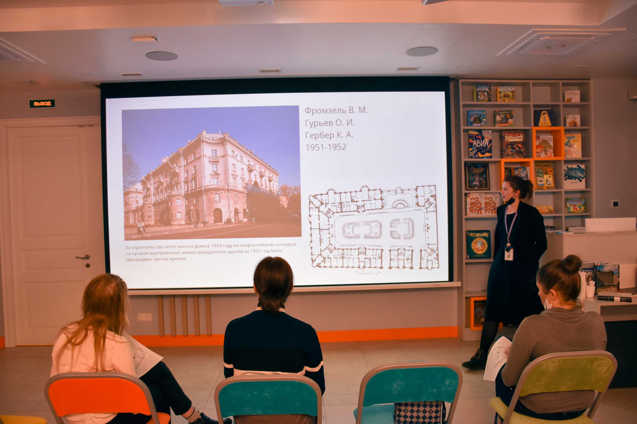 Сотрудники библиотеки подготовили для взрослых читателей лекцию о доме №20 на улице Ленина, посвящённую теме петербурговедения. Здание построено в стиле сталинского неоклассицизма архитекторами О. И. Гурьевым и В. М. Фромзелем.