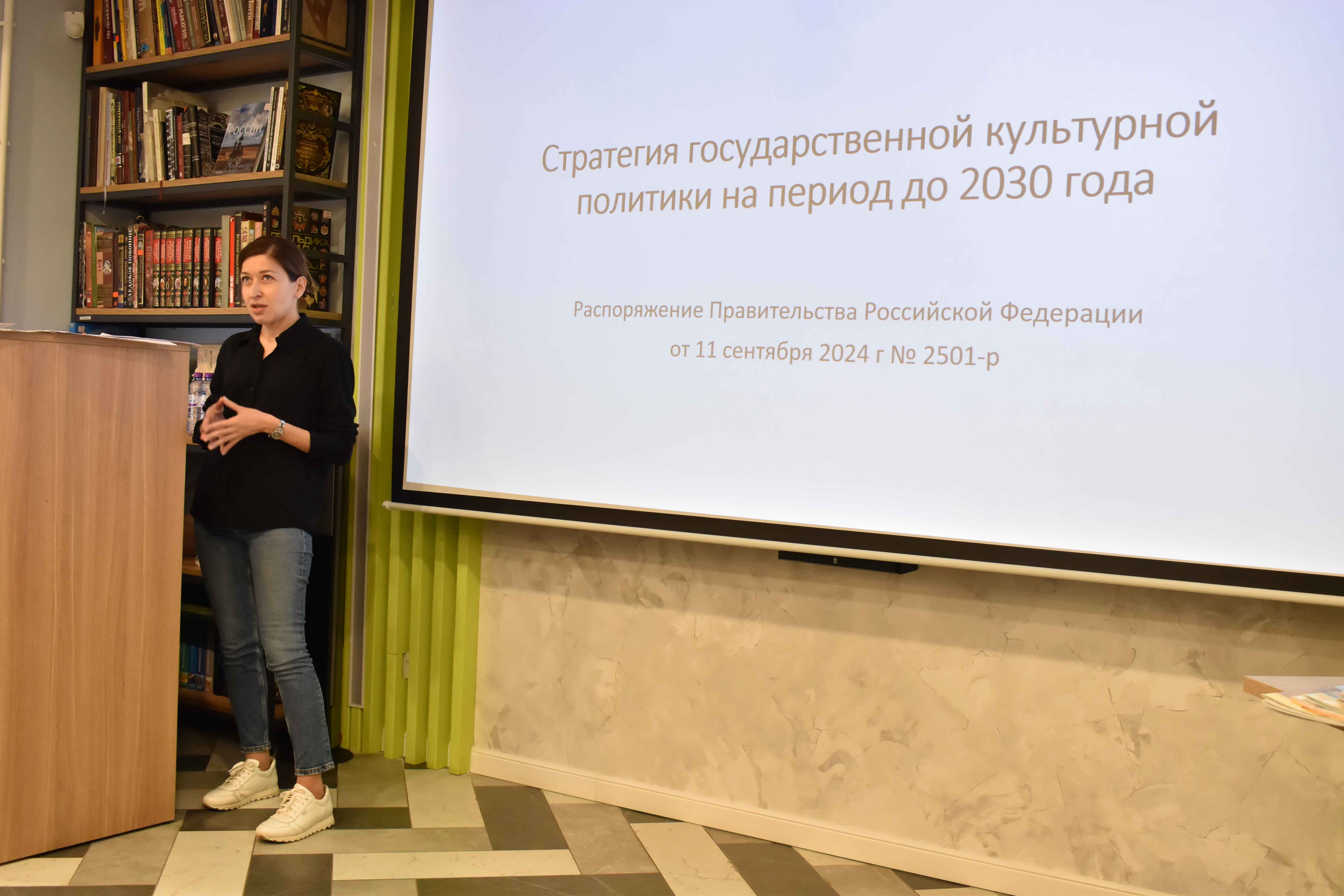 Вчерашняя Ирина Владимировна, заместитель директора по библиотечной работе СПб ГБУ «ЦБС Петроградского района», познакомила коллег со Стратегией государственной культурной политики на период до 2030 года и изменениями в законодательстве, касающихся библиотечной деятельности.